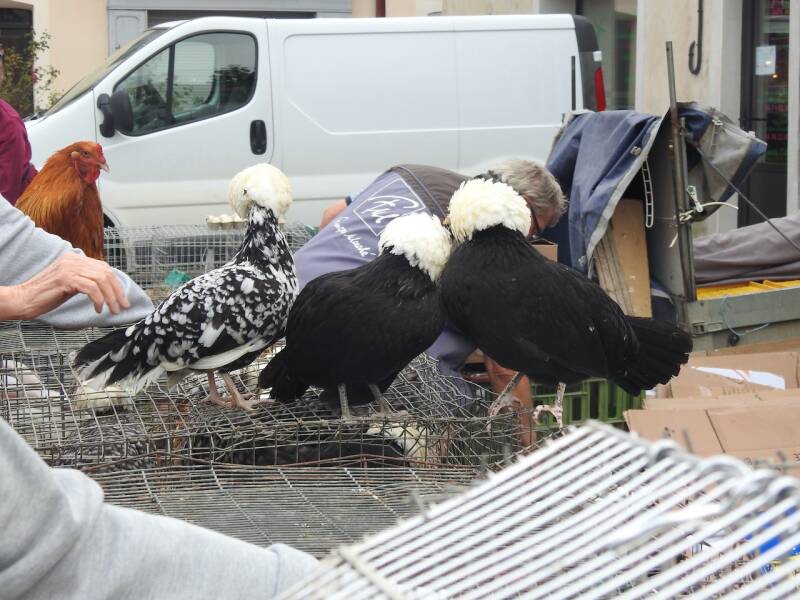 De markt moet volgens een spandoek de drie na leukste markt van Frankrijk zijn. Dan probeer je ook te ervaren waaraan dat predicaat verdiend is. Wellicht ligt het aan de hoeveelheid kippen die er te koop zijn, dat zullen de beroemde Bresse kippen wel zijn. Levend of aan het spit of anderszins bewerkt zijn ze aanwezig, evenals sierkippen die iets potsierlijk hebben vanwege een soort pruik of slobkousen maar ook eenden kun je er al dan niet levend kopen. Prettig vonden we het ontbreken van veel kledingkramen die vaak veel van hetzelfde hebben. We zagen slechts één kledingkraam en die was op het algemeen gericht op de oudere vrouw en er waren wollen kledingstukken, niet alleen de verkleurende bladeren kondigen de naderende herfst aan.
