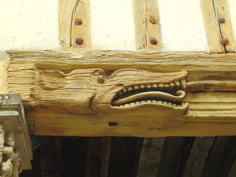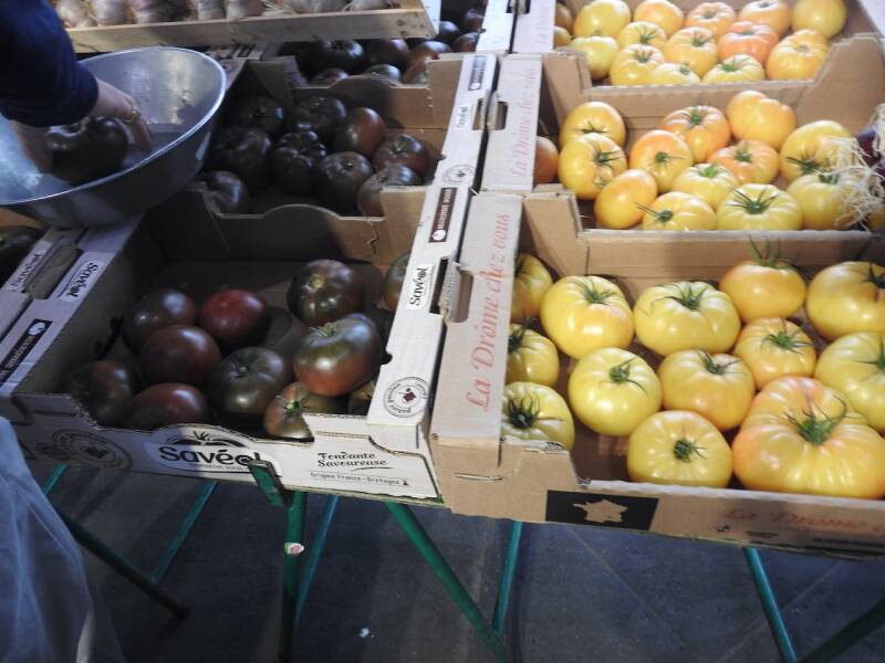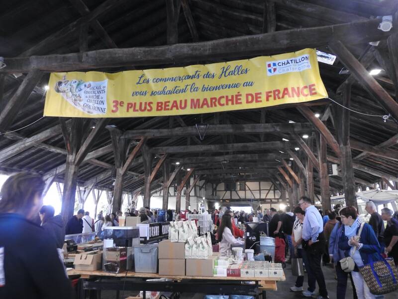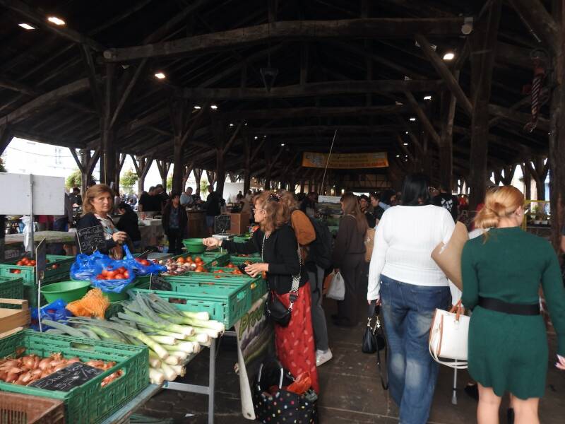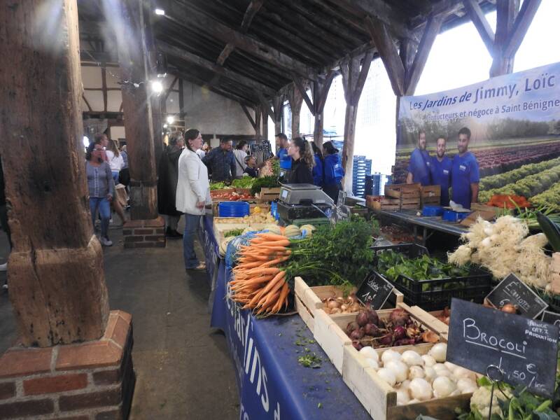En natuurlijk kraampjes met allerlei soorten worsten, veel soorten kaas en ook goed uitziende groenten. En bijzonder is zeker de plek, de grote hal, 80m lang, 20m. breed en 10 m hoog. Die toonde het belang van markten in de middeleeuwen. Oorspronkelijk uit 1440, verwoest door brand in 1670 en meteen identiek herbouwd, geconstrueerd uit 64 eiken.