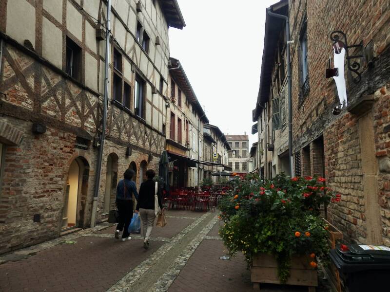 We zijn pas vanmiddag de lunch de stad ingegaan, eerst moest nog wel een klein maar langgerekt regengebied passeren, de laatste voorlopig, het moet hierna de komende dagend droog blijven. Maar omdat het regengebied wat verbrokkelde durfden we het wel aan. Eerst langs de office de tourisme , voor een plattegrond, daar proberen ze een proeverij voor ons te boeken. Maar als we dat willen regelen we dat zelf wel. We zagen weer een lange rij voor de ingang van Hotel Dieu staan, maar morgen zullen we die trotseren.
