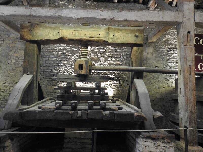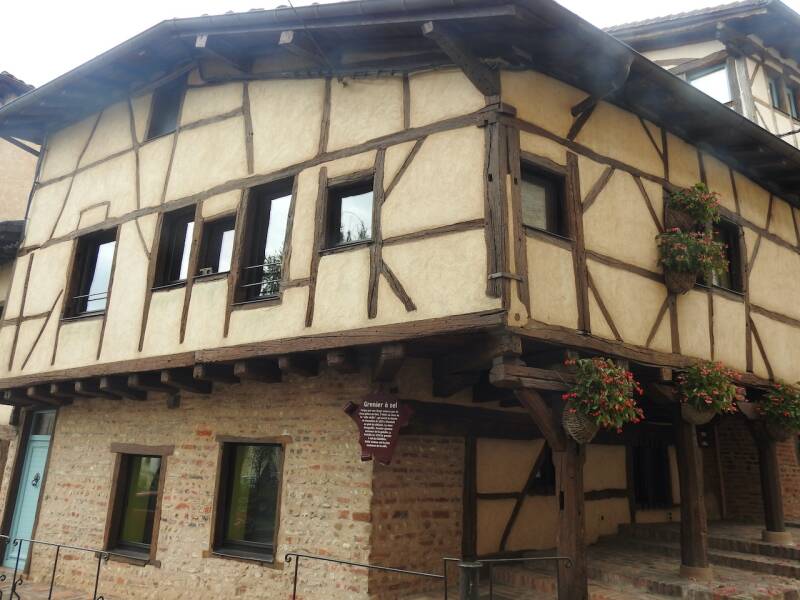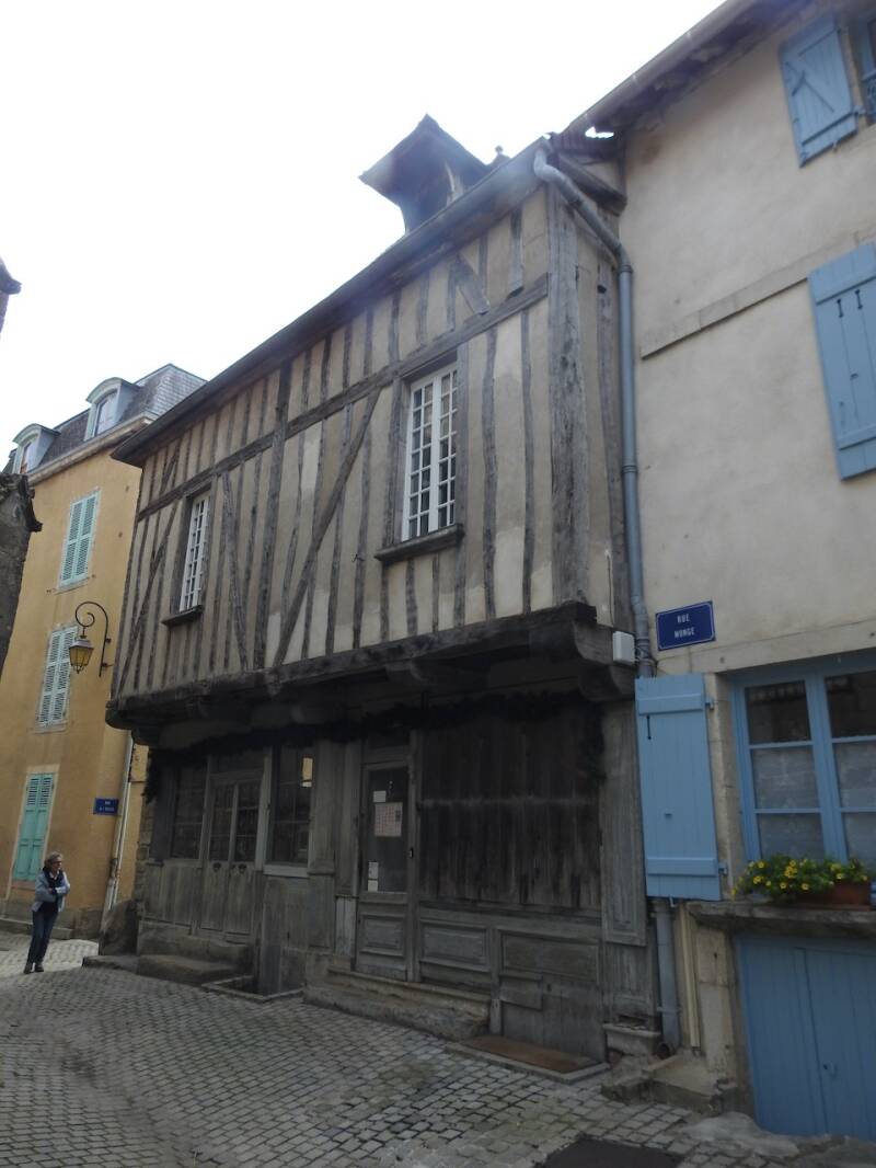 Daar staan een aantal oude wijnpersen maar wij kwamen voor de prachtige binnenplaats, erg mooie vakwerkhuizen. Een blik op de weerapp en het leek ons verstandig om naar de camper te gaan, Everdien was ook moe door slaapgebrek en we waren nog maar net in de camper of er kwam een regenbui voorbij die 1,5 uur duurde, de restanten van het verbrokkelde regengebied.