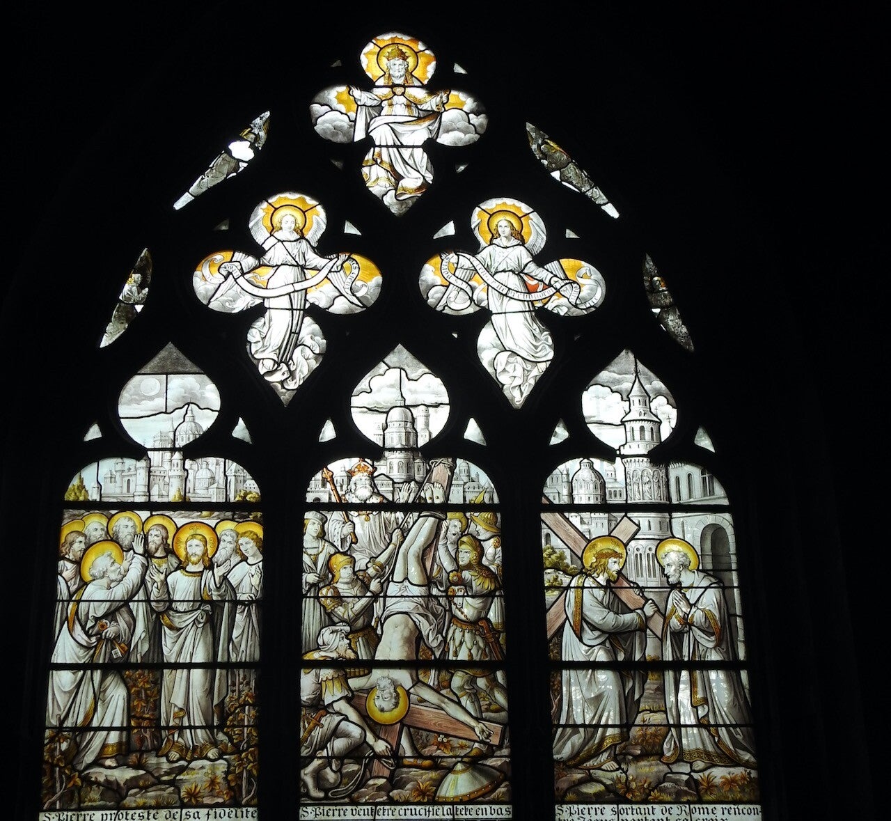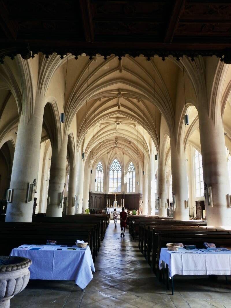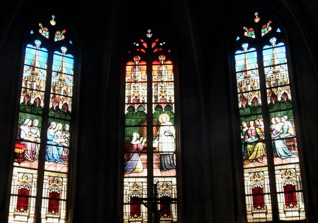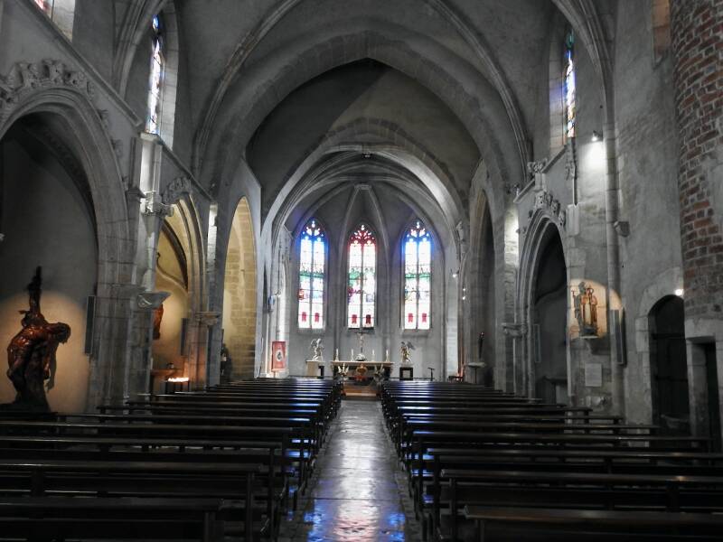 We hebben nog door een stukje oud centrum gelopen wat we nog niet gezien hadden en zijn toen naar de kerk gegaan. Die oogt somber gotisch van buiten, het interieur bevat enkele gebrandschilderde ramen. Buiten gekomen was men de markt aan het afbreken en waren wij vergeten geitenkaasjes te kopen.
