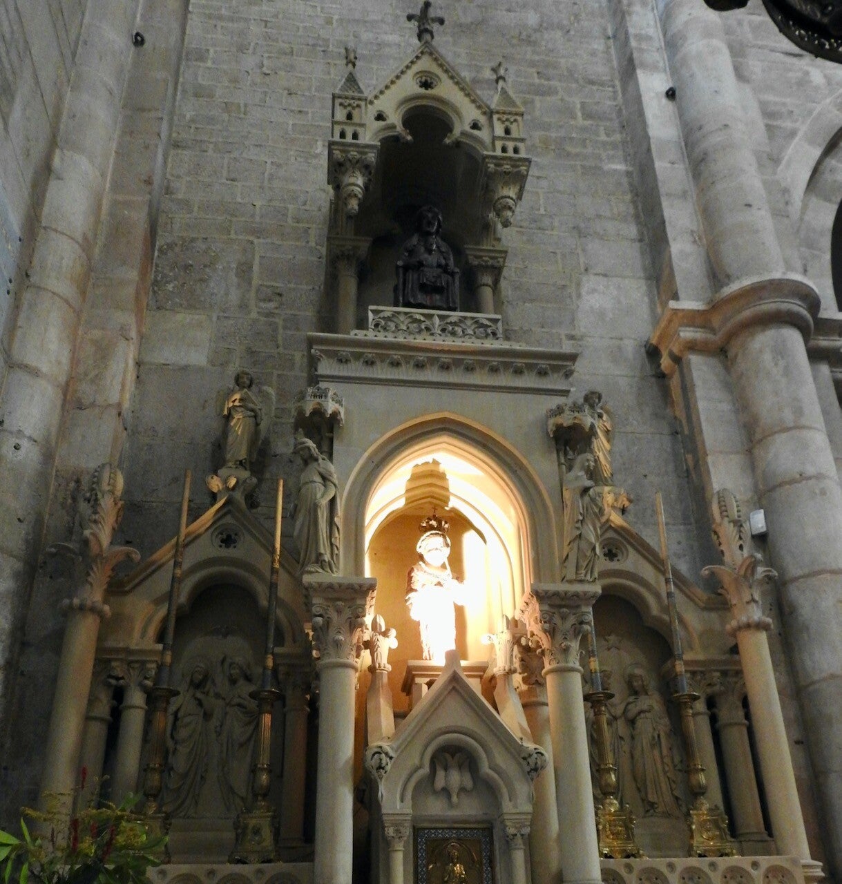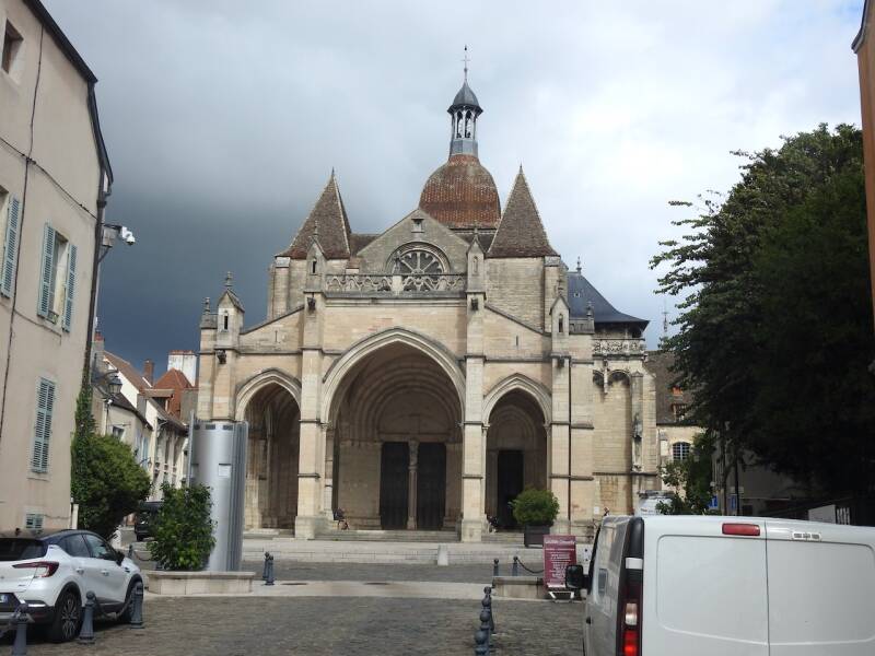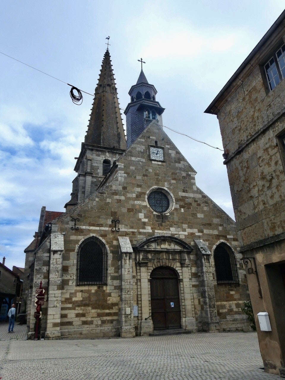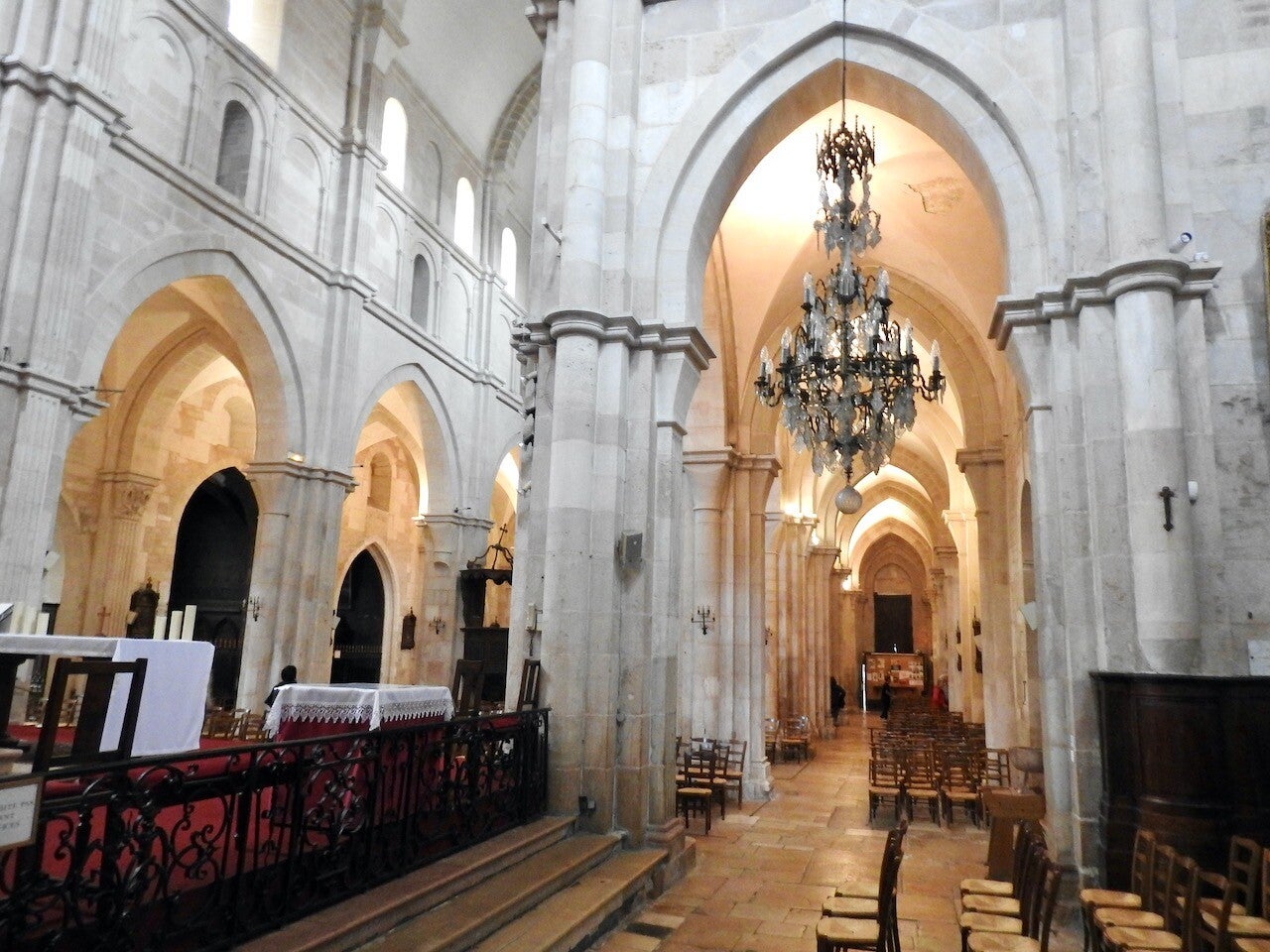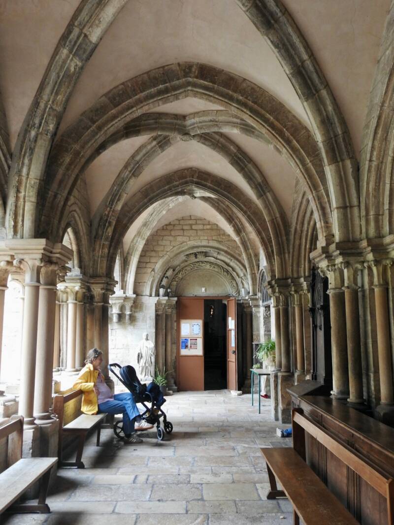 Omdat de lucht dreigend bleef hebben we naar een kleine wandeling besloten om naar de Collégiale Basilique Notre Dam de Beaune te gaan. Het is een Romaanse kerk uit de 12e eeuw, later uitgebreid met gotische elementen. Er zijn mooie glas-in-lood-ramen en we bewonderden een fresco uit de 15e eeuw die de wederopstanding van Lazarus uitbeeldt. Er hangen ook een aantal fraaie kroonluchters, die ons bekoren.