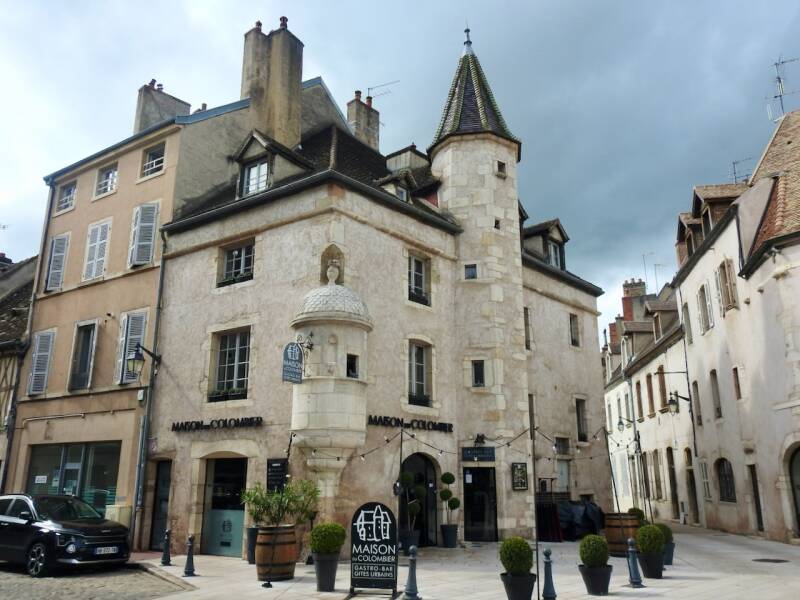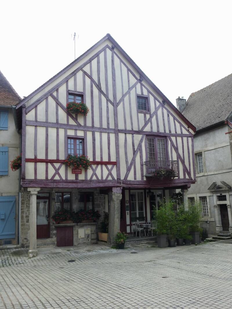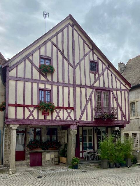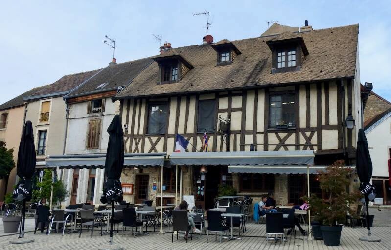 Er staan een paar middeleeuwse vakwerkhuizen, je ziet huizen met grote deuren, daaraan zie je dat je in een oud wijndorp bent. Toen we die bekeken hadden zochten we een restaurant op. We zagen op de menukaart van een pizzeria dat er pizza’s waren met escargots, Everdien een gruwel maar ik hou er van dus naar binnen toe. Er waren 2 formaten pizza’s, klein en groot, omdat we niet zulke grote eters zijn bestelden we de kleine. Met natuurlijk een heerlijk glas witte wijn erbij, Bourgogne Aligoté. Toen we de pizza’s geserveerd kregen, dachten we dat er sprake moest zijn van een vergissing, zo groot waren ze. Nou we proberen het wel, ze waren heerlijk , zowel de Quatre Fromages als de Esgarcolade, we hebben ze helemaal opgegeten. Bij het afrekenen bleek dat we toch echt het kleine formaat hadden gehad, dat wordt later vanavond alleen een yoghurtje met wat fruit.