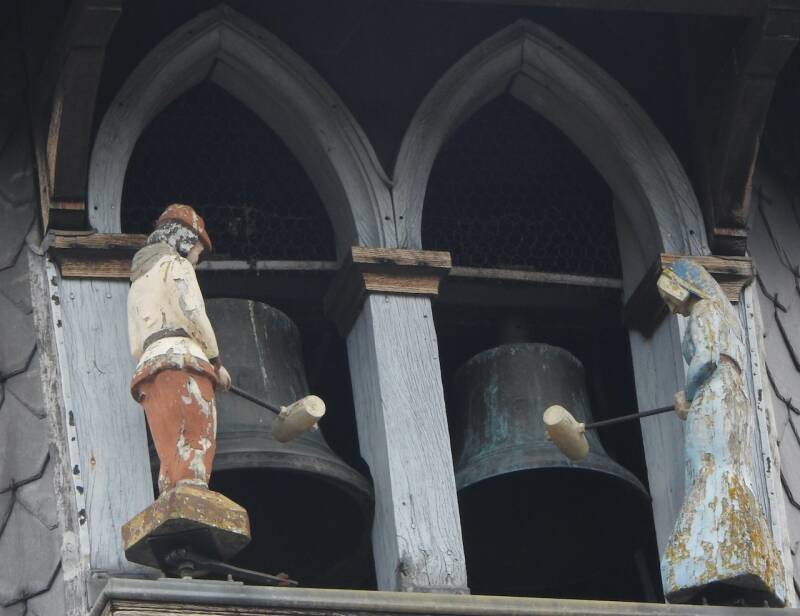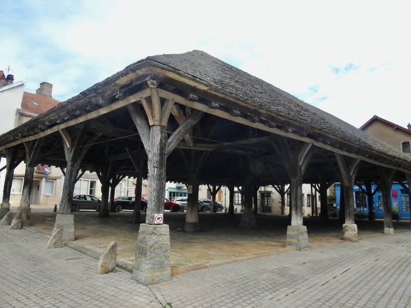 Nolay is een wijndorp met een kleine historische binnenstad, we zijn hier al eens eerder geweest en vonden het toen een leuk dorp. De cp is bij een voetbalveld en een gedeelte van de cp is een petanque baan. Het is 500 m naar het dorp lopen, na de koffie zijn we naar het kleine historische centrum gewandeld. De kerk was gesloten, in de klokkentoren zie je een mannetje en vrouwtje die met een hamer op de klokken slaan. Een toeristisch belangrijk punt zijn Les Halles uit de 14e eeuw. Klein in vergelijking met de markthallen in Chatillon gisteren maar met een bijzondere dakconstructie. De markthallen zijn bedekt met kalksteenplaten met een gewicht van 800 kg per vierkante meter.