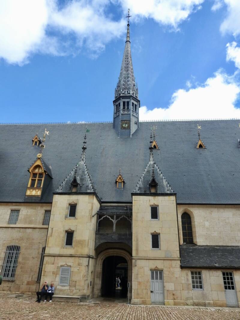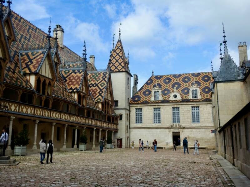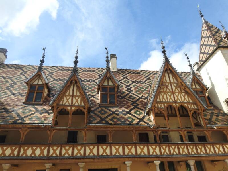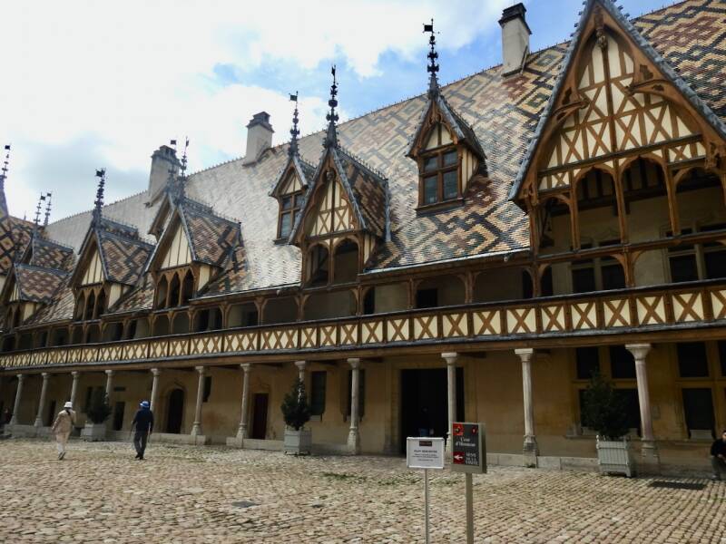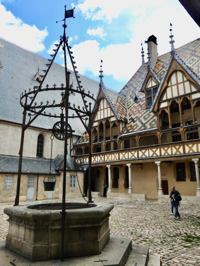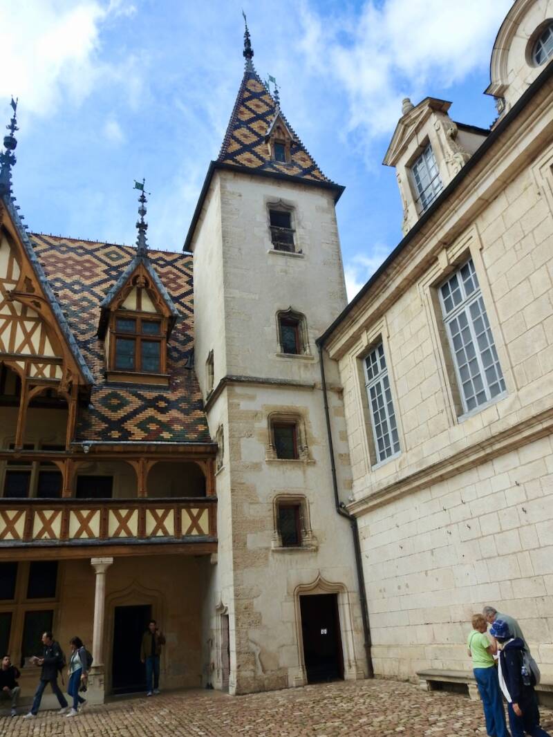 Oorspronkelijk was Hôtel Dieu een ziekenhuis voor de armen, gesticht door een rijk echtpaar, het is nog lang een ziekenhuis geweest maar is nu vooral een museum. Als je de sombere façade ziet verwacht je niet zoveel schoonheid want er schuilt een gebouw achter die deels voorzien is van geglazuurde dakpannen , waarvan je op een paar plekken in Beaune een glimp van kunt opvangen. Het is al een lust voor het oog om vanaf de binnenplaats om je heen te koekeloeren, je ziet houten dakkapellen, veranda’s en galerijen en de daken zijn bedekt met geglazuurde dakpannen in een geometrisch patroon.