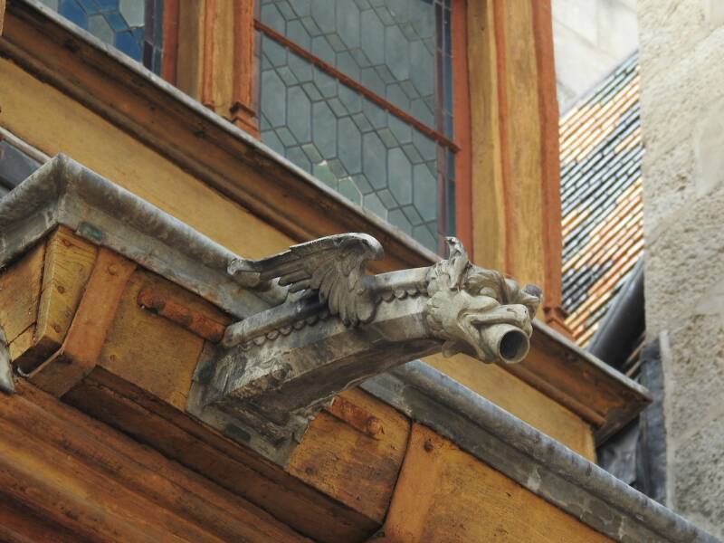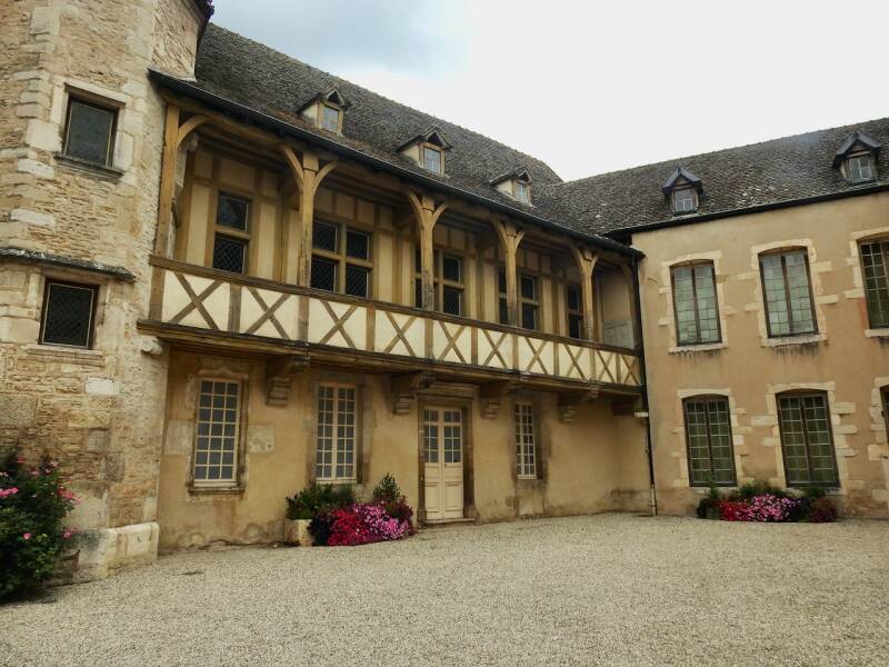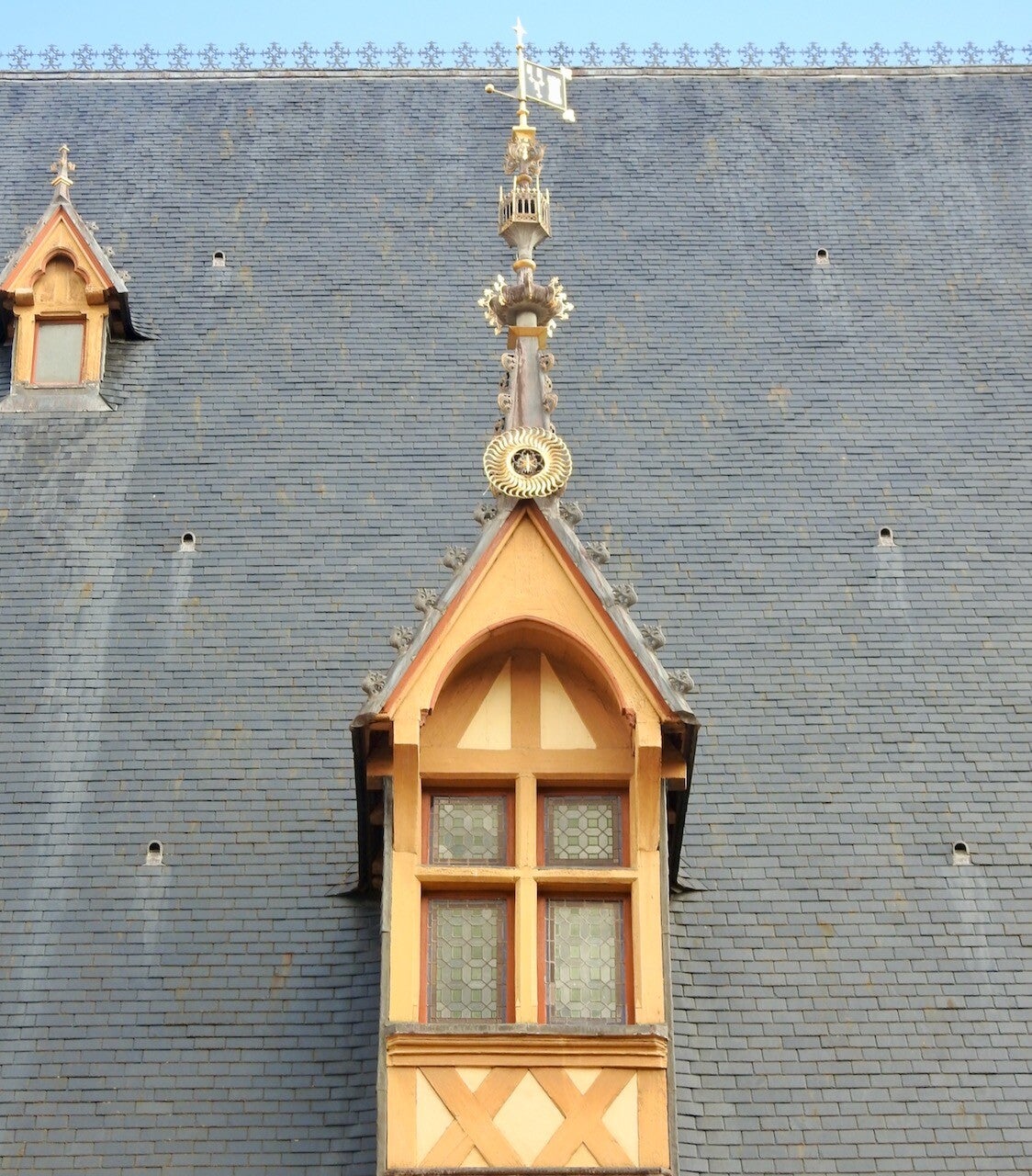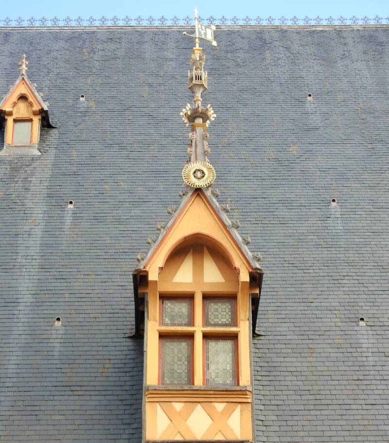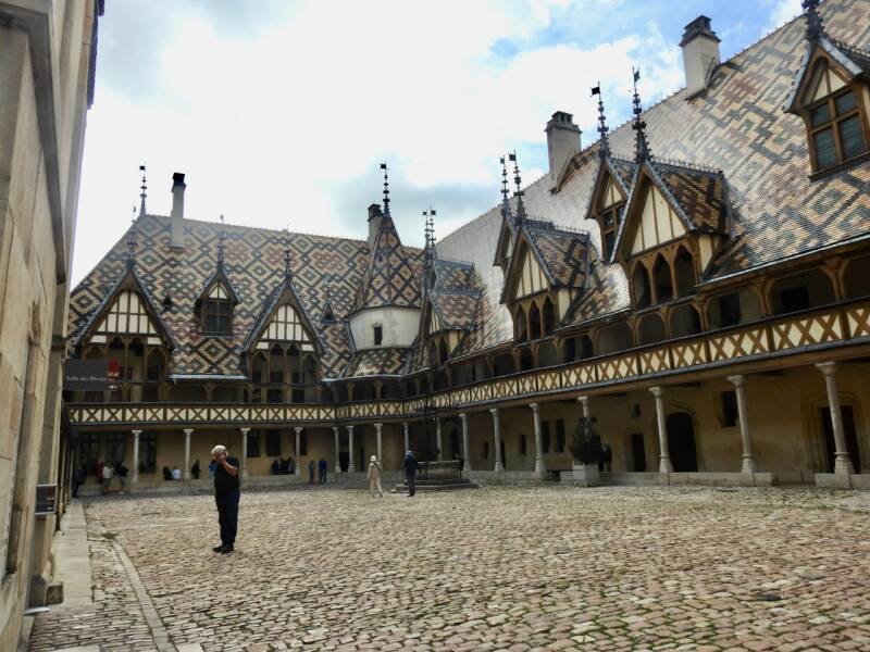Oorspronkelijk was Hôtel Dieu een ziekenhuis voor de armen, gesticht door een rijk echtpaar, het is nog lang een ziekenhuis geweest maar is nu vooral een museum. Als je de sombere façade ziet verwacht je niet zoveel schoonheid want er schuilt een gebouw achter die deels voorzien is van geglazuurde dakpannen , waarvan je op een paar plekken in Beaune een glimp van kunt opvangen. Het is al een lust voor het oog om vanaf de binnenplaats om je heen te koekeloeren, je ziet houten dakkapellen, veranda’s en galerijen en de daken zijn bedekt met geglazuurde dakpannen in een geometrisch patroon.