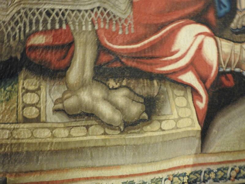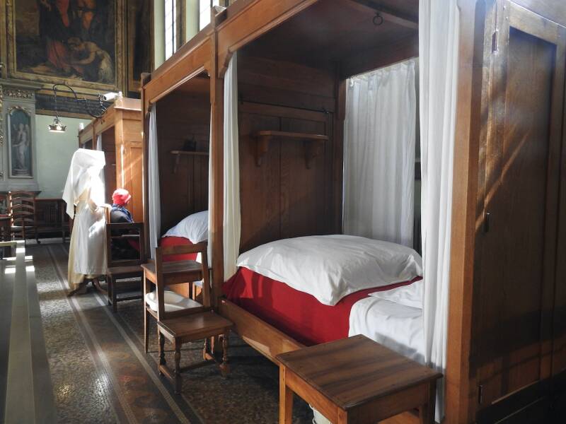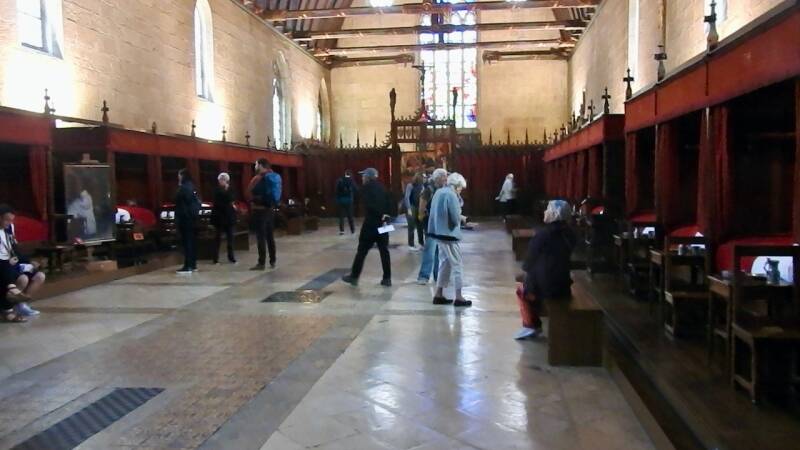 In een andere zaal, St Nicolas, zie je schilderijen, wandkleden en wat medische attributen waaronder zilveren nappen om wijn uit te drinken. Want niet alleen het personeel mocht wijn drinken omdat het zo gezond was, 1 liter per dag, er zijn dagen dat we minder drinken, ze moeten toch tamelijk bezopen rond hebben gelopen. Ook patiënten, ja zelfs kinderen, mochten wijn drinken vanwege de geneeskrachtige werking, professor Scherder zou bij een bezoek vuurrood aanlopen en spontaan een lezing beginnen. Het ziekenhuis beschikte over eigen wijngaarden, nog steeds en je kunt deze prijzige wijn kopen.