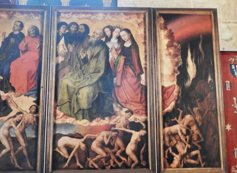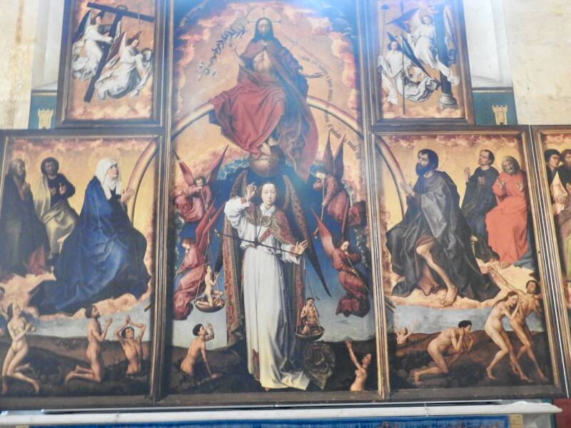 Het pronkstuk van het ziekenhuis is het schilderij ‘Het laatste Oordeel’ , bestaande uit 7 panelen. Het is geschilderd in de 15e eeuw door de Vlaamse schilder Rogier van der Weyden en het stond op het altaar in de ziekenzaal, daar werd voor de zieken de mis opgedragen.. Daar staat nu een replica en in een kamer die de juiste klimatologische omstandigheden heeft, staat nu het origineel. Op het middenpaneel prijkt Christus zittend op een regenboog met zijn voeten op de wereldbol. Er is heel veel te zien, engelen die op een klaroen blazen, de aartsengel Michael , apostelen en als op een schilderij van Jeroen Bosch kruipen doden uit de openbarstende aarde. Uitverkorenen gaan het paradijs binnen en verdoemden naar de hel. Iemand die bijbelvast is zal veel, zo niet alles kunnen duiden wat er op het schilderij te zien is, wij vonden het indrukwekkend.