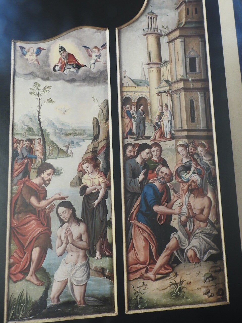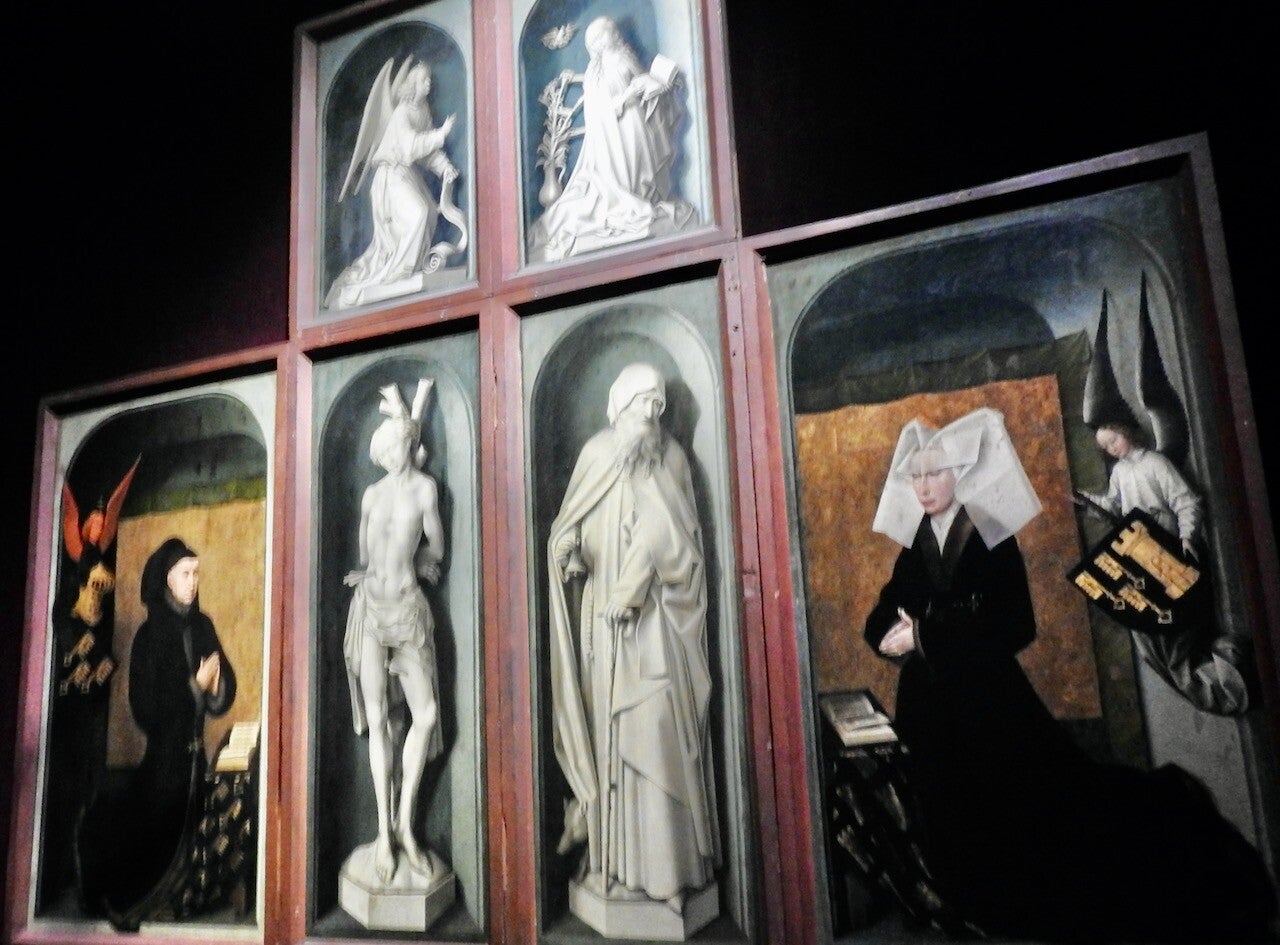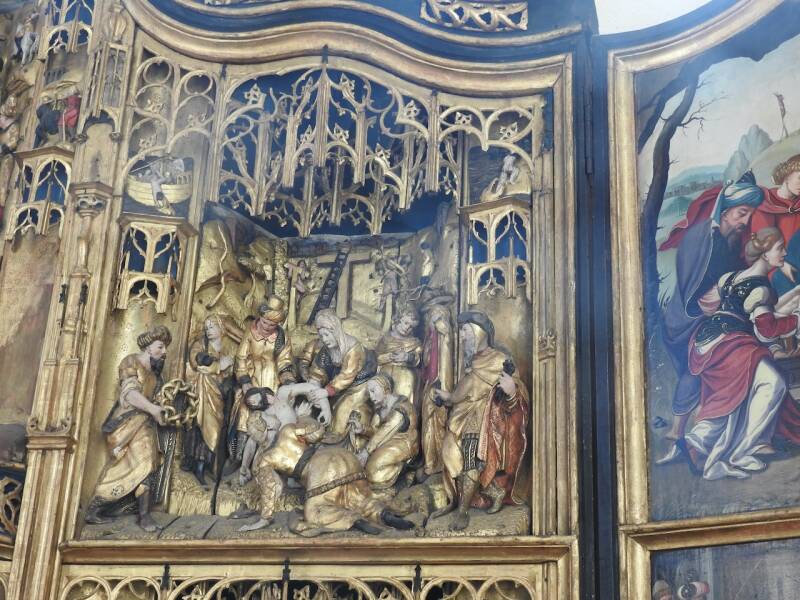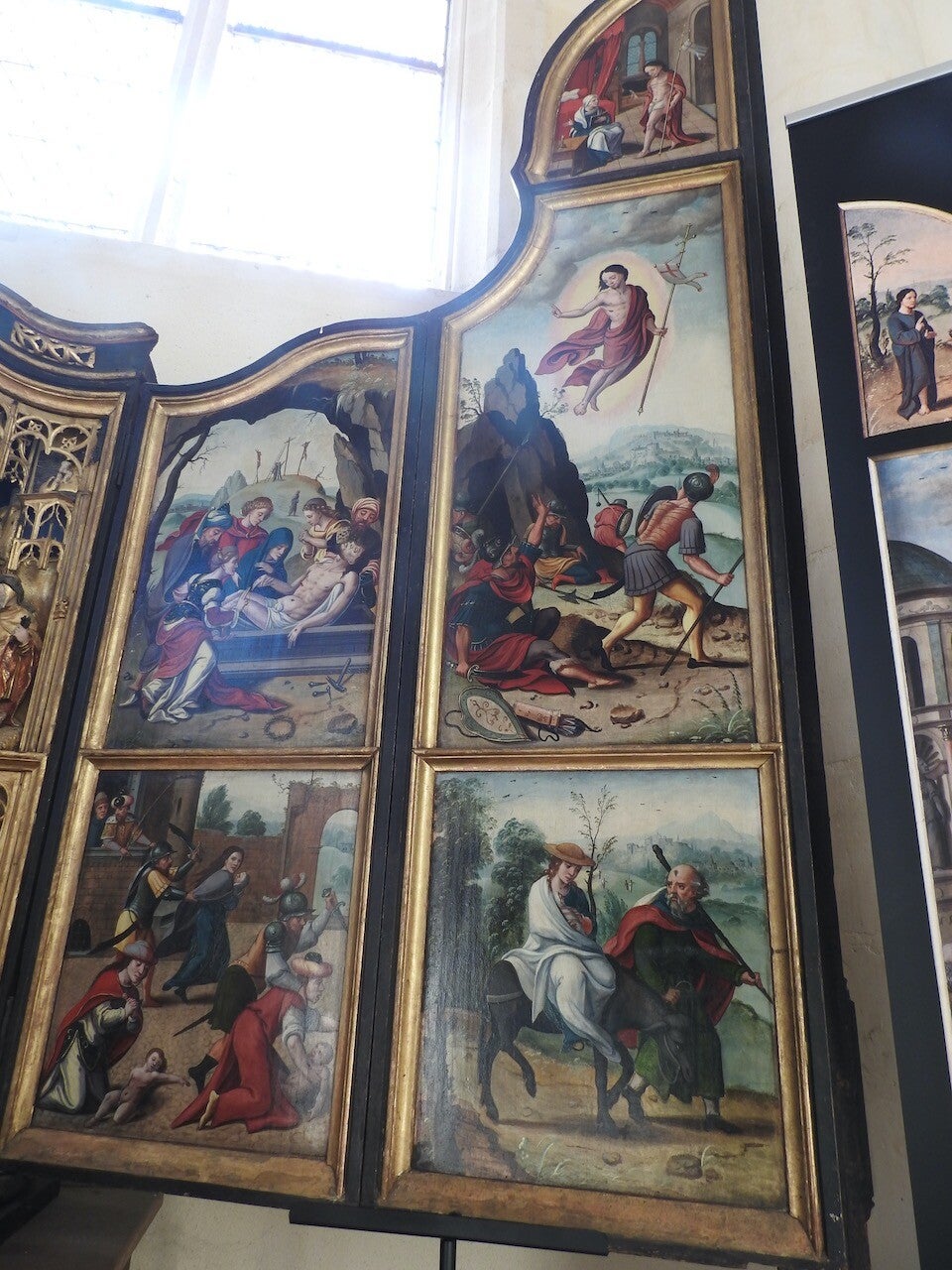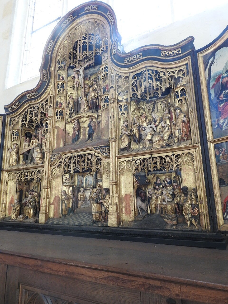 Het is een drieluik dat deels geschilderd is en deels bestaat uit reliëfs van goud, dat is het centrale gebeeldhouwde gedeelte. Het is werkelijk prachtig om te zien, als het drieluik open is zie je afbeelding die de paastijd moeten voorstellen, en hij was nu geopend. Als de geschilderde zijluiken gesloten zijn stelt het de evangelies van de vastenperiode voor. Ondanks het feit dat je het drieluik niet helemaal kon zien, er staat een getralied hekwerk voor, kon je heel goed de details zien, die prachtig waren. De zon scheen pal door de ruiten achter het drieluik, dus hadden we last van tegenlicht bij het maken van foto’s.