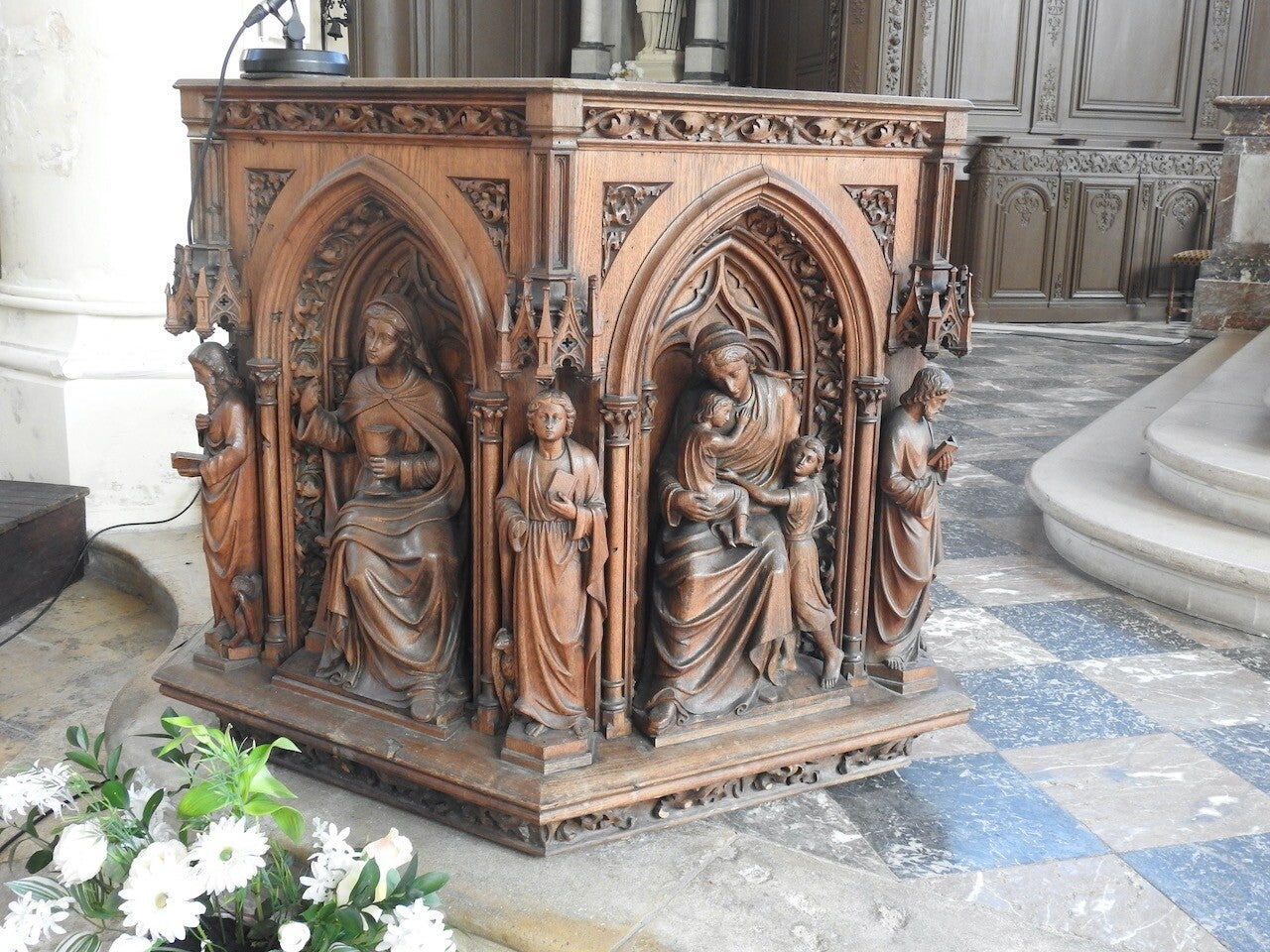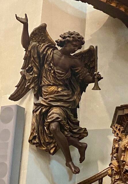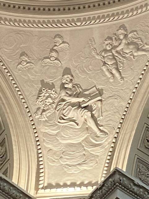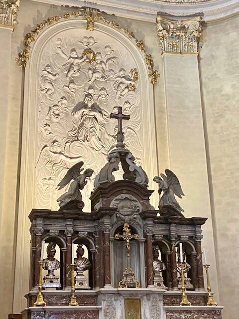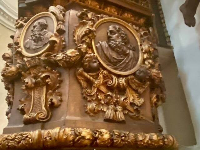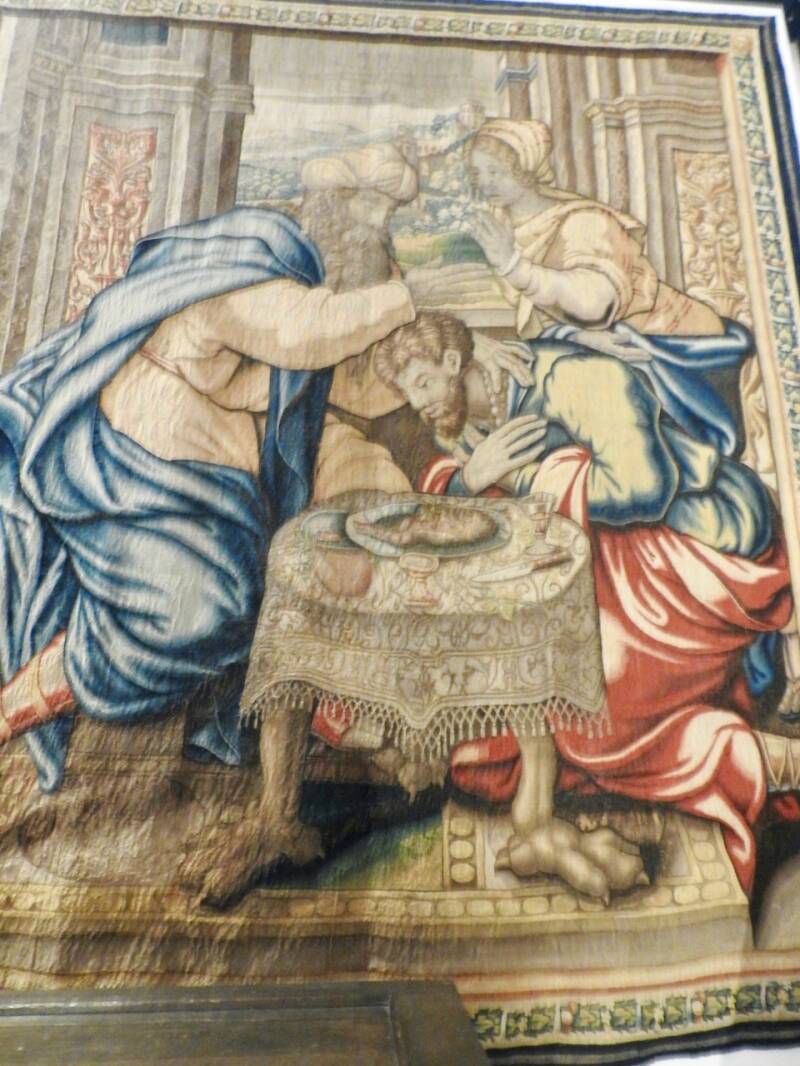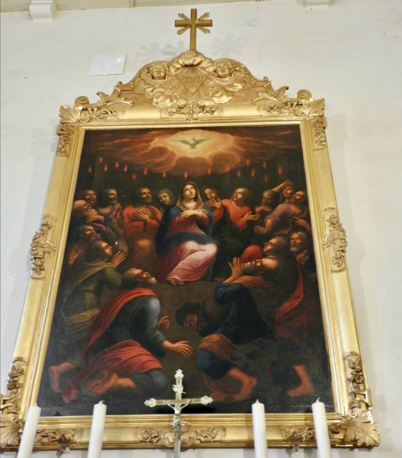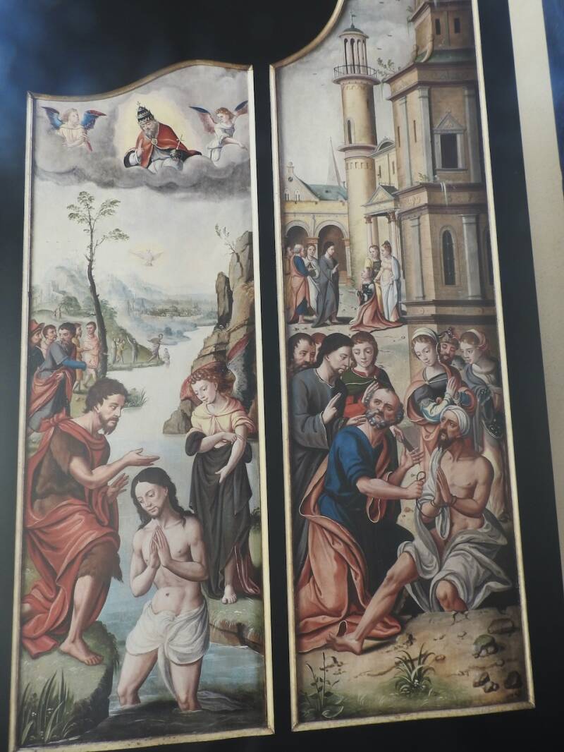 Het is een drieluik dat deels geschilderd is en deels bestaat uit reliëfs van goud, dat is het centrale gebeeldhouwde gedeelte. Het is werkelijk prachtig om te zien, als het drieluik open is zie je afbeelding die de paastijd moeten voorstellen, en hij was nu geopend. Als de geschilderde zijluiken gesloten zijn stelt het de evangelies van de vastenperiode voor. Ondanks het feit dat je het drieluik niet helemaal kon zien, er staat een getralied hekwerk voor, kon je heel goed de details zien, die prachtig waren. De zon scheen pal door de ruiten achter het drieluik, dus hadden we last van tegenlicht bij het maken van foto’s.