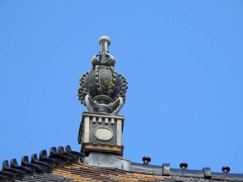 Foto’s maken was niet altijd even makkelijk, lampen belichten de schilderijen en voorwerpen en dan viet er ook nog eens soms fel licht binnen door ramen als de zon scheen. Dat merkten we ook toen we weer op de grote binnenplaats kwamen, er is ook een kleine binnenplaats met beelden van het stichters-echtpaar, dan scheen de zon fel en dan weer was het bewolkt . We hebben nog even wat op details ingezoomd en zijn vervolgens blij dat we het prachtige ziekenhuis weer bewonderd hadden, naar buiten gelopen.