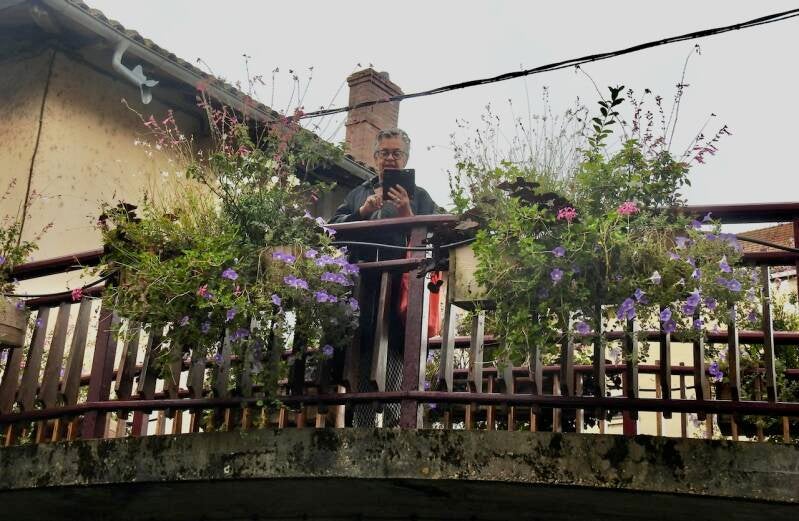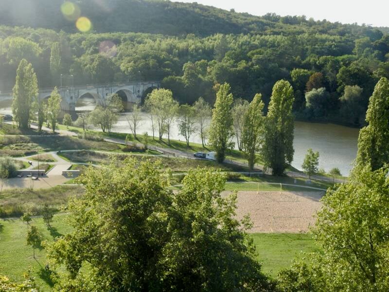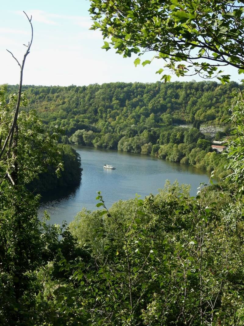 Omstreeks het middaguur zijn we naar het stadje gewandeld, over de brug en je bent in het centrum waar het gezellig druk was. We zochten een restaurant uit, het werd Pierre Boneventure, daar zat het bomvol, een goed teken, we konden nog een tafeltje bemachtigen. We kozen beiden voor zalm met een romige cognacsaus en lekker gekruide gebakken gekruide aardappeltjes en ijs na. Na de lunch terug gewandeld naar de camper en de hele middag gelezen bij de waterkant en af en toe met de Belgen gebabbeld. Wat een geluk dat we de laatste dagen in Frankrijk mooi weer (zullen) hebben.