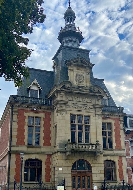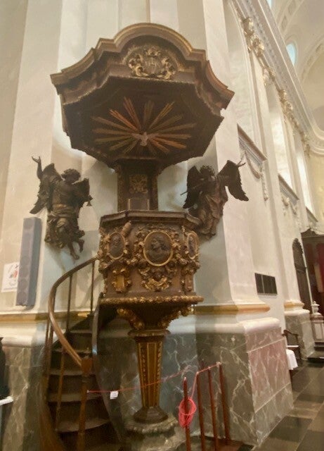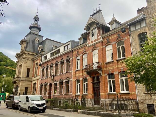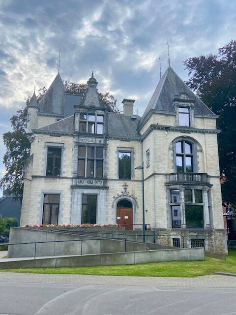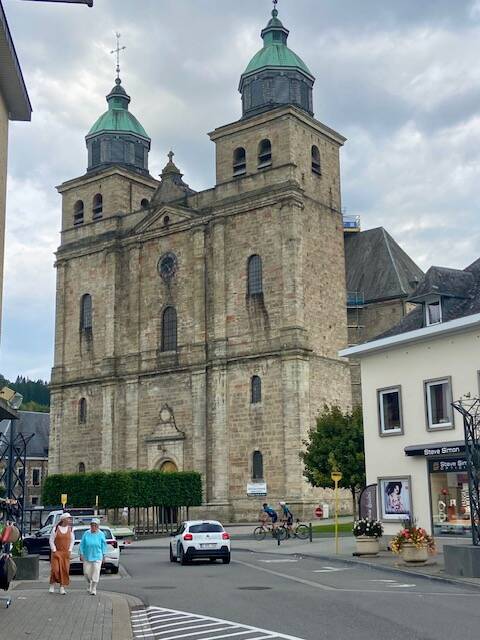 Het zag er de hele middag dreigend uit maar het bleef toch droog dus hebben we de stoute schoenen, ik met steunzolen , aangetrokken en zijn naar de stad gegaan. Malmedy heeft een klein maar gezellig centrum, rondom het plein Place Albert 1er zijn veel terrassen. Daaraan ligt ook de kathedraal HH Petrus Paulus en Quirinus, waarvan de naam mooier is dan de kerk maar die vooral een mooie preekstoel heeft. Naast de kerk ligt het oude klooster Malmundarum wat nu een museum is, waar je kunt zien dat de geschiedenis van Malmedy bestaat uit leerlooierijen en het vervaardigen van papier . Dat museum vonden we minder interessant, wel trok ons een aantal prachtige huizen, waaronder villa’s uit de Belle Époque periode, waarvan sommige de uitstraling hebben van een klein kasreel .