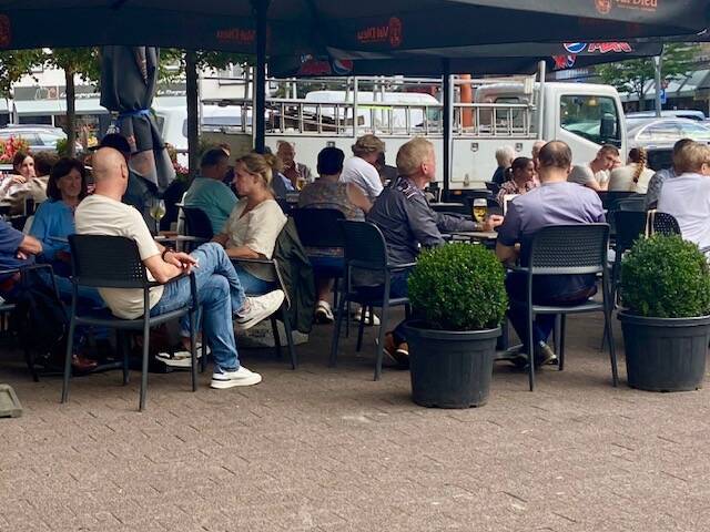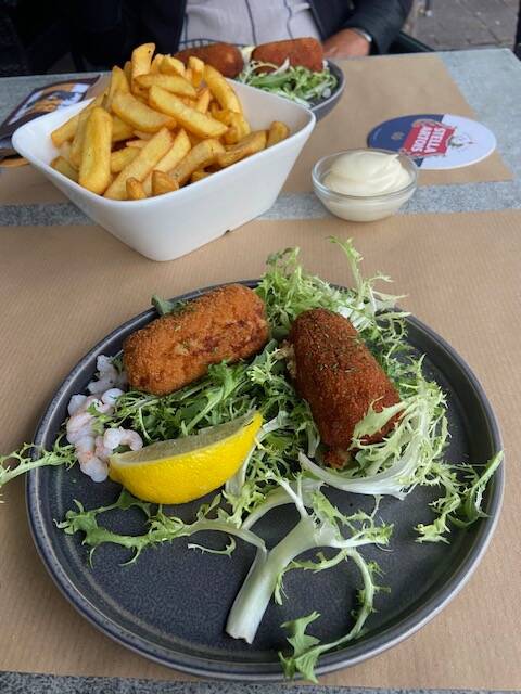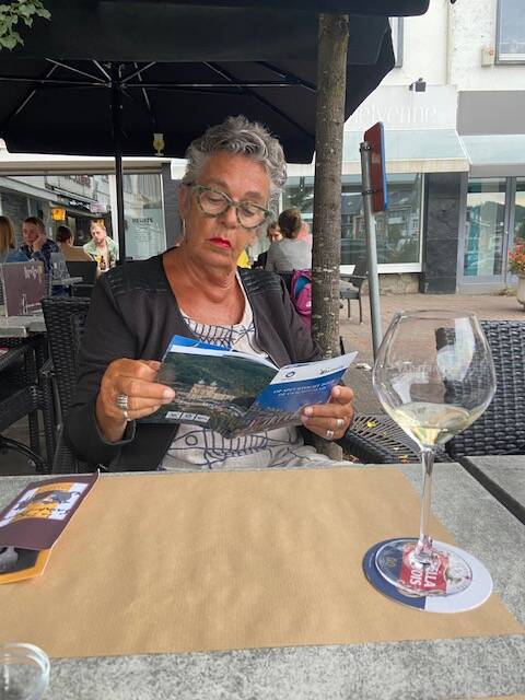 Het werd tijd , omdat er ogenschijnlijk buien naderden, een restaurantje op te zoeken, we vonden er één waar ze garnalenkroketten op de kaart hadden staan. Met respectievelijk witte wijn en La Choufe bier smaakten ze voortreffelijk, daarvoor hoefden we niet naar Bilzen te rijden. Het centrum met zijn vele terrassen vonden we gezelliger dan Bilzen, zeker omdat ze ook nog druk bezocht werden, ook omdat het droog bleef. Elk voordeel heb zun nadeel , we moeten morgen wel wat verder rijden om weer thuis te komen.