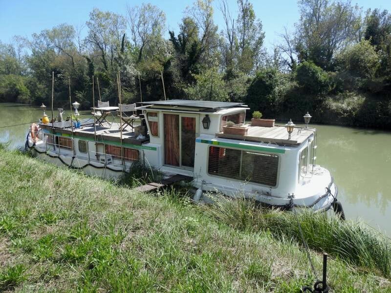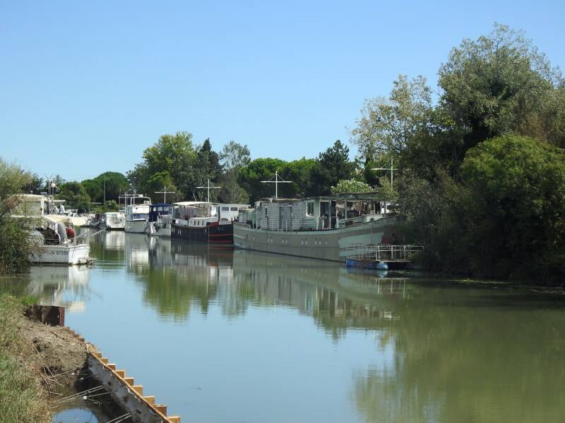 Dat werd keurig geregeld en we arriveerden vanmiddag op een cp waar we een blij gevoel van kregen na de aanvankelijke deceptie van die gribus plek in Aramon. Eerst waren we langs een gebied gereden die we goed kenden van al die jaren dat we in de Camargue zijn geweest en m.n op het naturisten strand Plage de Piemanson hebben gestaan. Bellegarde ligt tussen Arles en Nîmes in aan de rand van de Camargue. We stonden aan een haventje aan een kanaaltje, de plezierboten lagen voor onze neus, helemaal tevreden met dit plekje. We heb een stukje langs het kanaal gewandeld en zijn daarna gaan lezen. 2 andere campers die daar stonden vertrokken, misschien moeten die werken of weten die meer dan wij?