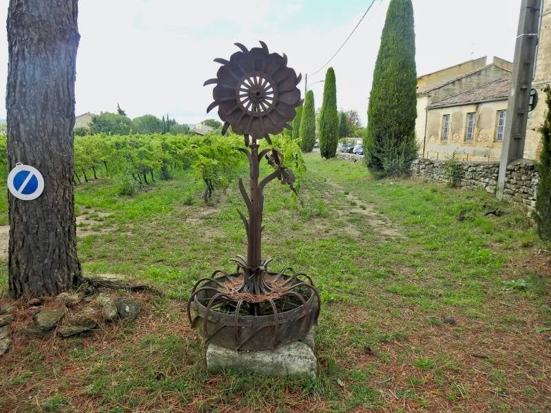 We hadden gisteren al zo’ vermoeden dat er door de Mistral weinig van fietsen zou terecht komen. De wind wakkerde aan tot 60 km p.u., dan is fietsen, ook op een elektrische fiets niet leuk. En omdat er een vlagerige wind stond, is dat nog gevaarlijk ook, hoewel dat vanmiddag nog wel mee viel. Nu zijn we wel blij met de regen van gisteren, als het droog is stuift het erg bij de droge wind die de Mistral is . Wie ook blij zijn met de Mistral zijn de boeren, dan kunnen de druiven weer drogen en kan men verder met de oogst voor zover dat nog niet gebeurd is. De oogst van de Côtes du Rhône is door klimaatverandering de laatste decennia vervroegd met gemiddeld 17 dagen. Hier rondom ons heen zijn alle druiven al geoogst, dat scheelt weer een hoop lawaai van ’s morgens vroeg tot ’s avonds laat met tractoren met aanhangers vol druiven.
