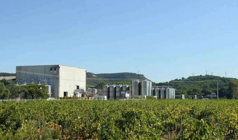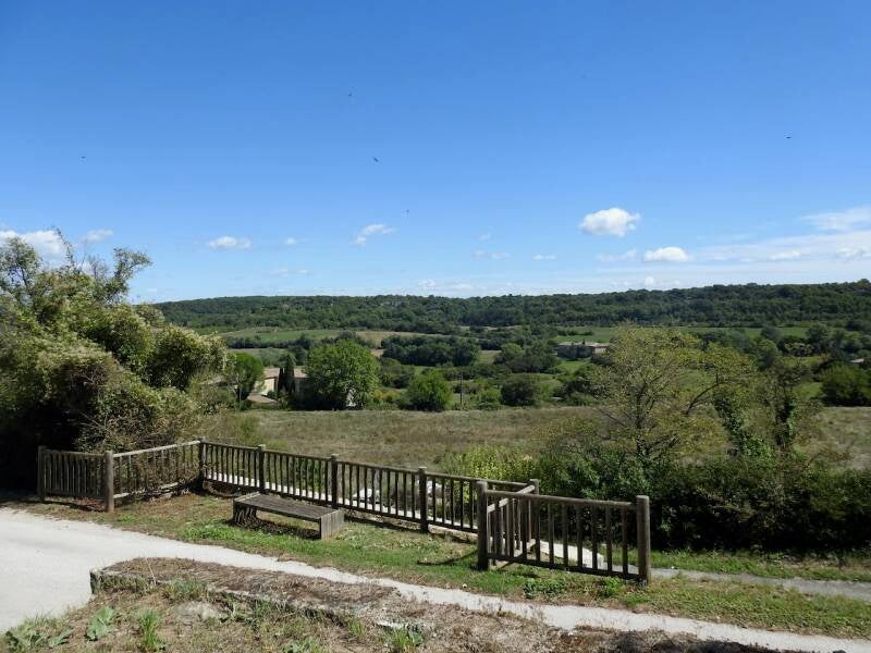 Dus zijn we om een uur of 11 op de fiets gesprongen, hoewel dat meer op de fiets stijgen is op onze leeftijd. We gingen de richting uit die een handwijzer ons wees. Eerst nog een klein stukje langs de Lone, gisteren had ik dat riviertje en wat chiquere naam gegeven. We passeerden door het bos 2 meertjes, niet verkeerd. Maar al snel bleek dat we wel verkeerd fietsten toen we bij een bedding van een droge sloot kwamen. Dan maar via Kaarten, de Google Maps van Apple proberen. Er bleken 3 routes mogelijk, we kozen voor de snelste route die het minst leuk bleek. Eerst dwars door Codolet, toen een stuk over een dijk en vervolgens over een D weg waar ook autoverkeer was. Maar na de afslag naar Chusclan werd de weg heel rustig. Toen fietsten we tussen de wijngaarden door en zagen al spoedig de wijncoöperatie van het dorp liggen, herkenbaar aan de grote roestvrijstalen wijntanks. Tegenover de coöperatie lag de cp, daar zijn we even wezen kijken. Een beetje een kale vlakte maar toch niet onaardig.
