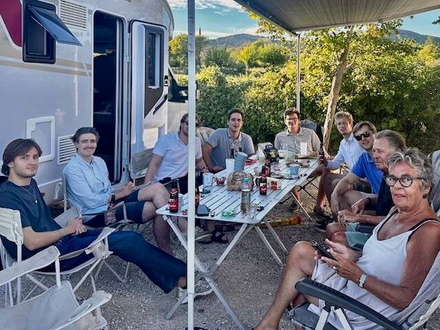 Aan het eind van de middag kwamen er 2 Belgische campers met 8 jongens , die ons uitnodigden voor een pintje. Ze waren hier op deze cp omdat ze vrienden hadden ontmoet die hier in de buurt woonden. Het waren Walen en sommigen spraken Vlaams . Die vrienden zouden ook nog komen, het werd een feestje vanavond. Na een drankje zijn wij weer naar de camper gegaan.