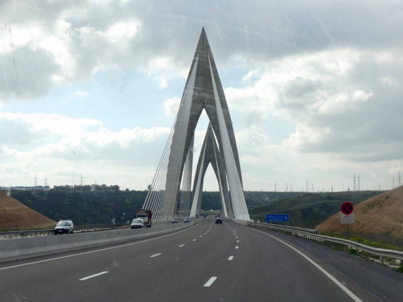 We zijn nu voor de derde keer over de langste tuibrug van Afrika gereden(950m), Mohammed VI, die 's nachts prachtig verlicht moet zijn.
