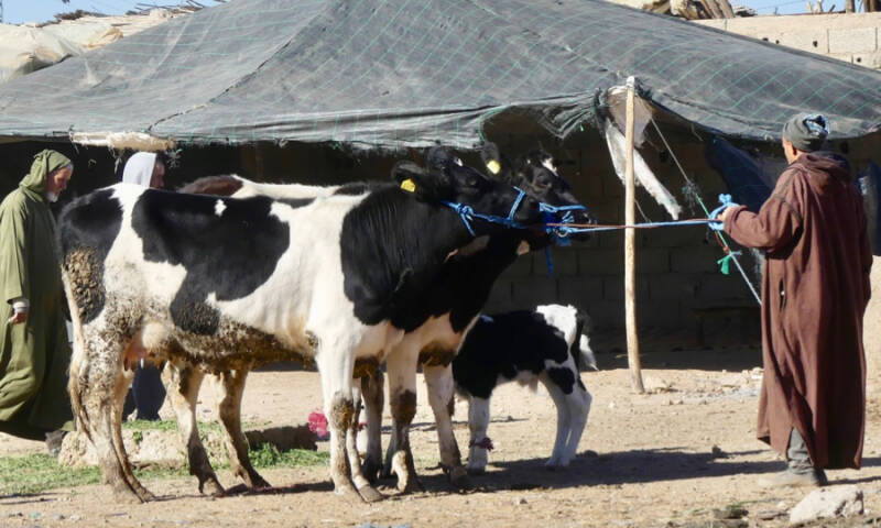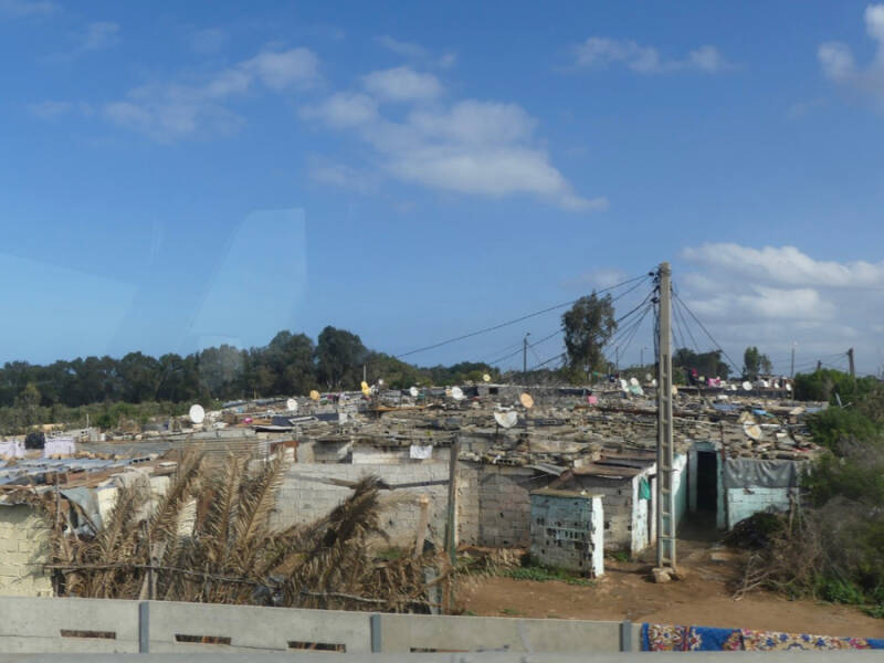 Het noorden is vruchtbaar, het is groen omdat het nogal veel geregend heeft de laatste tijd, te zien aan de grote plassen op de velden. Er wordt overal op het land gewerkt, er lopen kuddes schapen en je ziet af en toe een paar koeien, dik onder de modder. En in de buurt van Moulay Bousselham zie je veel landbouw onder plastic. We realiseerden ons dat we gisteren eigenlijk nauwelijks vrachtverkeer hadden gezien, zou er net zoals in West Europa een verbod zijn op zondag of was het toeval?