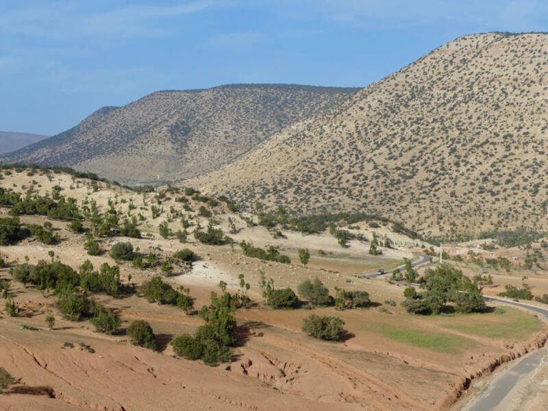 Chichaoua ligt niet ver van de tolweg die van Marrakech naar Agadir loopt, we zijn via de tolweg naar Taroudant gereden. Meestal gaan we via de kust naar het zuiden, gaan we zoals nu door het binnenland, dan gaan we via de tolweg, €8,20 voor ongeveer 180km. Totaal was het trouwens 240km. Toen de tolweg er nog niet lag gingen we wel via de N8 en dan deed je er aanzienlijk langer over dan nu om de Atlas over te komen. Nu in nog geen 2 uur anders had je wel eens pech en hing je kilometers achter een moeizaam omhoog zwoegende vrachtauto met boomstammen, dat schoot echt niet op. Het genieten van de schoonheid van het landschap werd weldra teniet gedaan door de irritatie van de slakkengang.