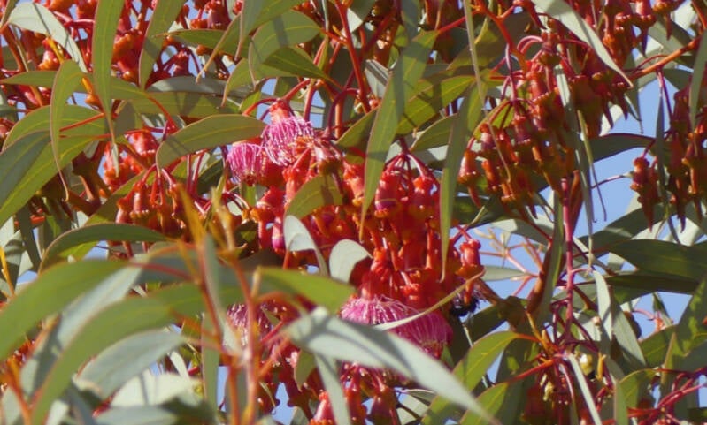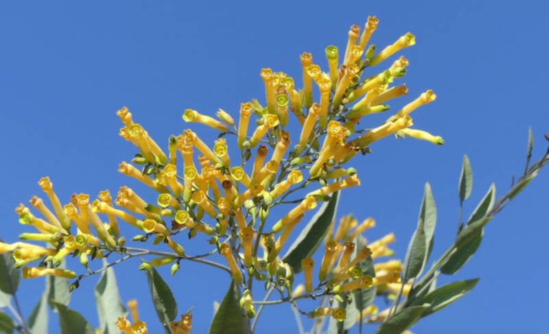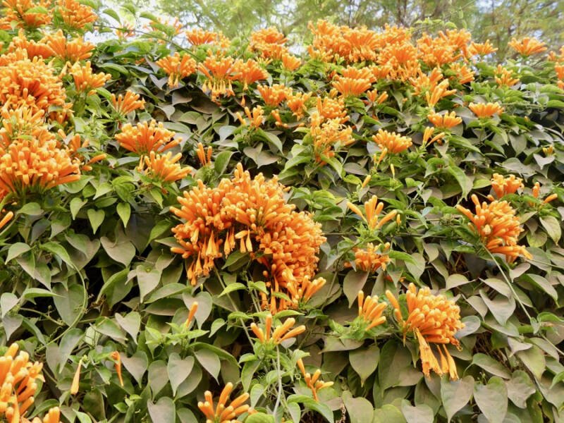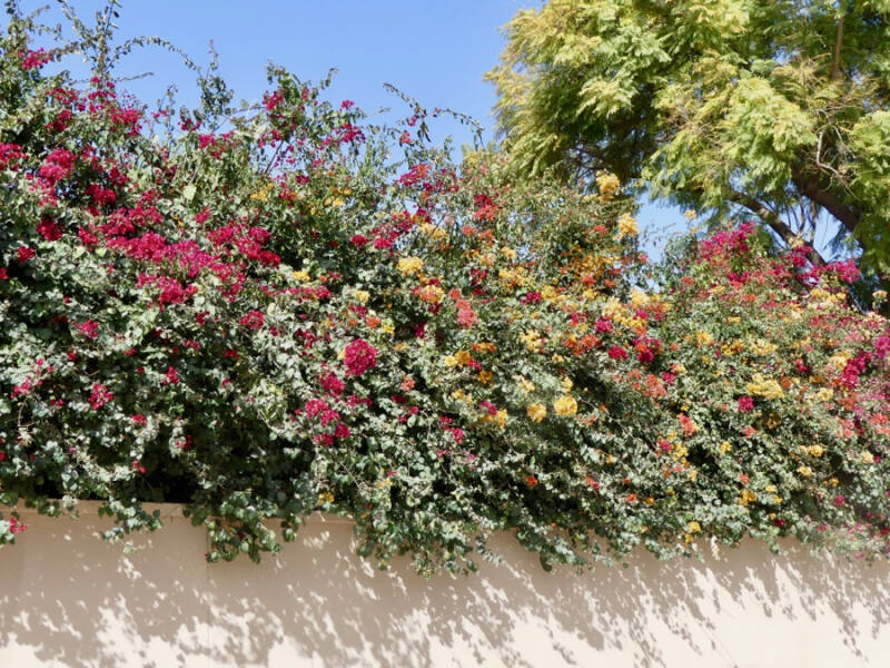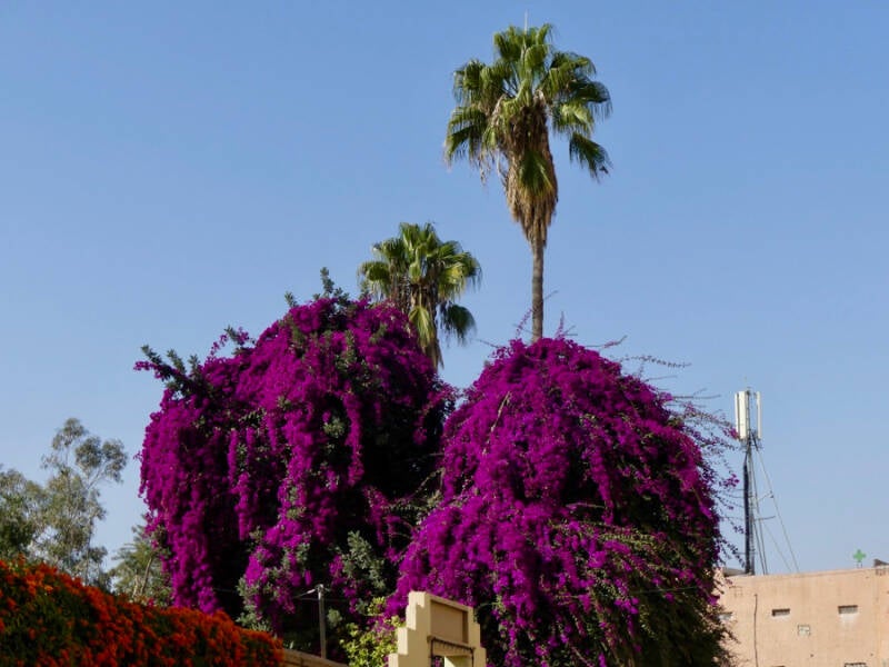 Op verschillende plaatsen in de stad zie je uitbundig bloeiende bougainvilles in diverse kleuren mogelijk een Campsis soort