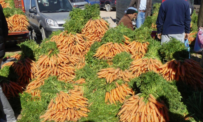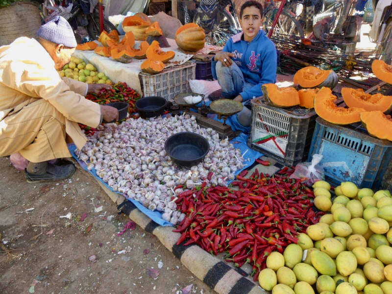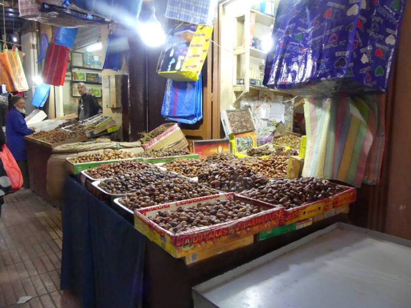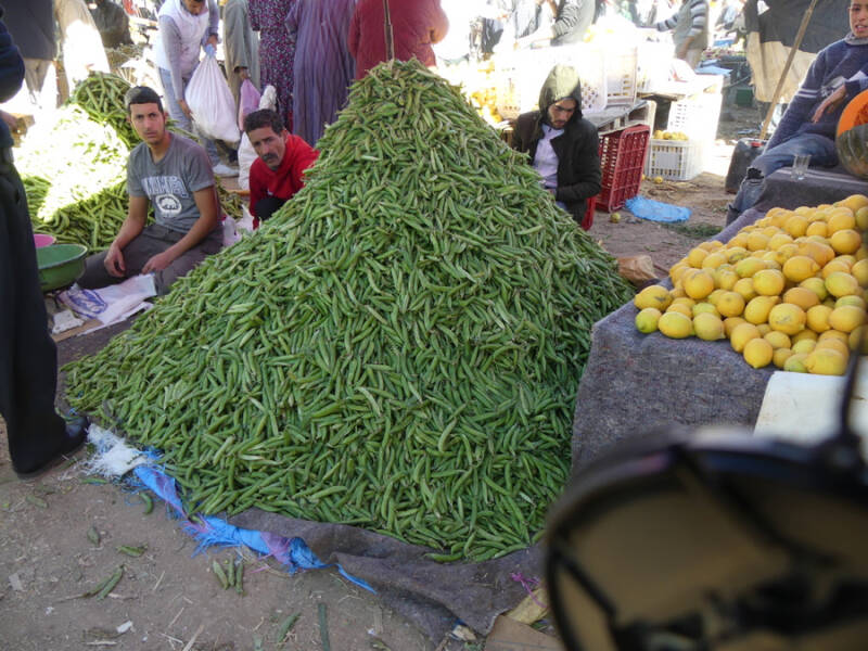 We hebben sinaasappels en olijven gekocht, sperziebonen waren niet te vinden en dat terwijl die boontjes die je in deze periode in Nederland koopt vaak uit Marokko komen. Wel een ruim aanbod van doperwtjes en tuinbonen als we ons tot de peulvruchten beperken. Overigens is het fruit en groente erg goedkoop, sinaasappels €0,28 per kilo, mandarijnen €0,19.