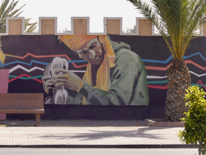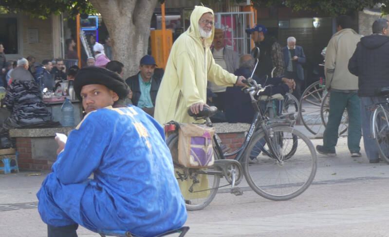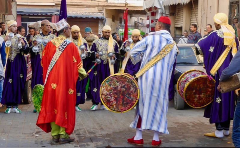 Taroudant wordt ook wel Klein Marrakech genoemd, beide hebben stadsmuren en bij beide zie je de vaak besneeuwde toppen van de Hoge Atlas op de achtergrond . Heeft Marrakech zijn wereldberoemde plein Djemaa El Fna, in Taroudant heb je het veel kleinere Place Assarag waar ook muziekgroepen, verhalenvertellers en slangenbezweerders optreden. Altijd leuk om daar overheen te slenteren, het plein ligt ongeveer een half uur lopen van de camperplaats. Aan het eind van de middag zijn we daar heen gegaan, even later komt het plein dan tot leven. We hebben daar een jus d’orange gedronken en hebben even bij diverse optredens gekeken, die van de Gnau groep sprak het meest aan, ook vanwege een kleurrijk showelement.
