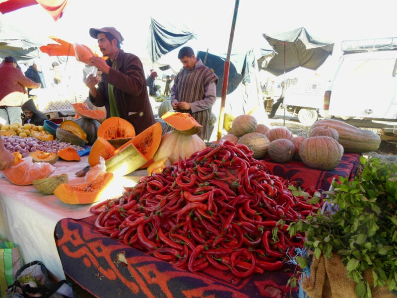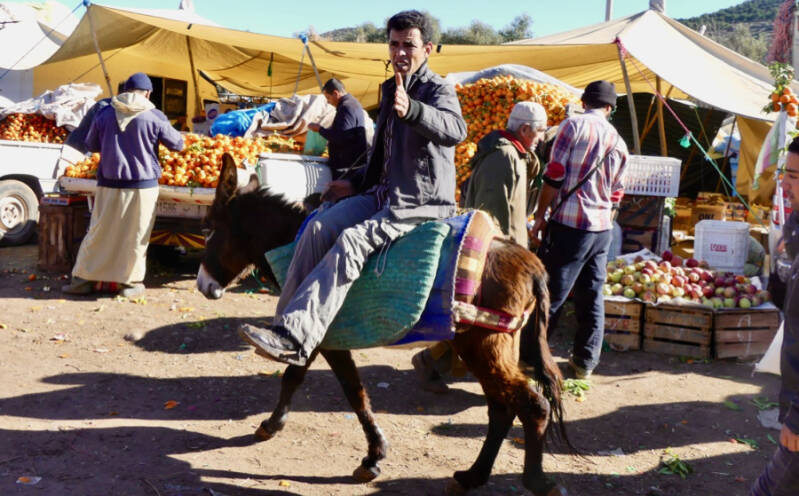 Toen ik goed en wel de taxi verlaten had merkte ik dat ik in Marokko was. Ik werd weldra aangeschoten door een jonge man, ik woon in dat Berberdorpje tegen de berg en een neef werkt in Utrecht. Na nog 2x vriendelijk doch resoluut een wannebe gids te hebben afgewezen, ben ik de weekmarkt opgewandeld. Deze week niet af van de andere markten in Marokko, groente en fruitafdeling, huishoudelijke artikelen, grote matten, gereedschap, koekjes, olijven en noem maar op. Wat opviel was de grote afdeling met 2e handskleding en -schoenen afdeling. Wel kippen en kuikens maar verder geen dieren hier, of het moet helemaal achteraan geweest zijn, zover ben ik niet gelopen. Want het was inmiddels 12 uur en ik moest een taxi terug vinden. Er is een soort taxistandplaats voor de grand taxi's die naar alle windstreken rijden. Een man met een geel hesje, jawel, noteert waar mensen heen willen en zodra een taxi vol is vertrekt die. Na ongeveer een kwartier wachten was de taxi naar Marrakech met 5 passagiers voldoende vol om te vertrekken en met ongeveer een half uur rijden stond ik weer op de camping.