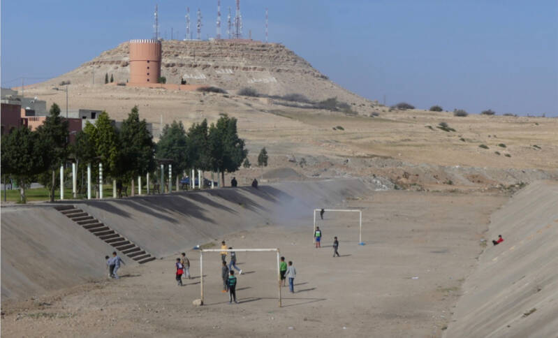 Jongens voetballen in een droge rivierbedding die hier in de stad gekanaliseerd is. Op de achtergrond veel masten van telecomaanbieders.