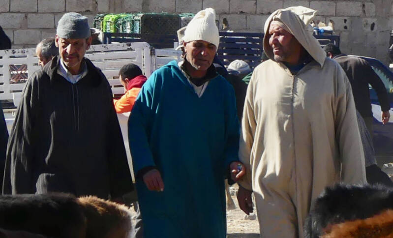 In Taroudant wordt de souk op zondag gehouden, zo’n souk is behalve een plek om iets te verkopen/kopen ook een belangrijke ontmoetingsplek, er komen bv boeren en kopers uit de wijde omtrek hier samen. Dus zie je mannen hand in hand, arm in arm of op elkaars schouder hangend lopen, louter vriendschap. Wel grappig om te zien die lichamelijke aanraking in een land waar homoseksualiteit nog steeds verboden is.