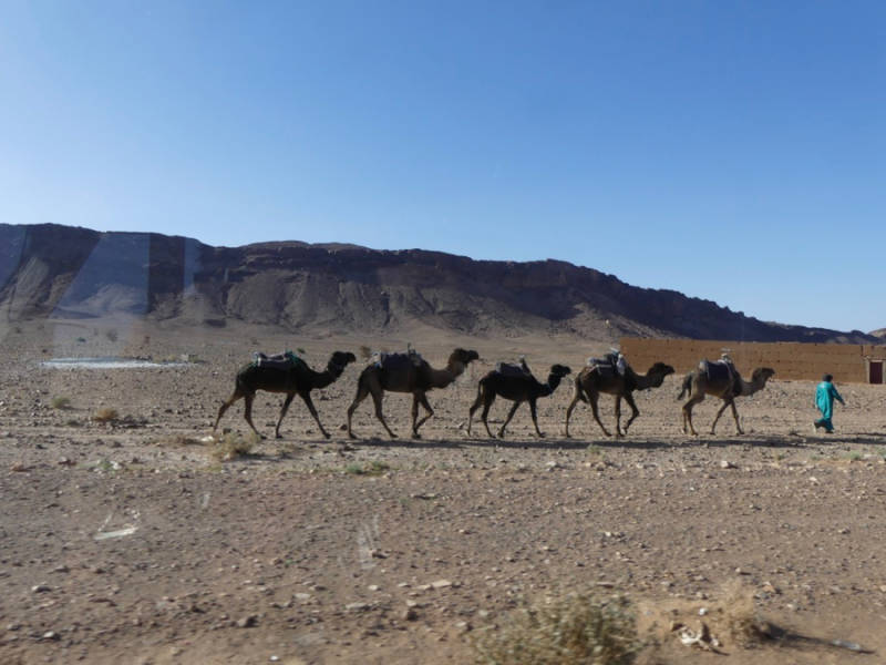 We zijn vanmorgen uit Zagora vertrokken, bestemming was Alnif, 170km verder, we zouden er op een kwartier na , 3 uur over doen. We zijn via de N12 gegaan, een route die we nog nooit eerder hadden gereden. Anders reden we door het mooie Drâadal naar het noord oosten, een aaneenschakeling van oases en wat kashba’s . Maar nu is sinds een aantal jaren de weg naar Tazzarine helemaal geasfalteerd. De 1ste 10km van Zagora kwam je telkens groepjes dromedarissen met een begeleider tegen w.s. op weg naar hotels in Zagora.