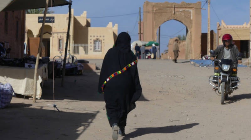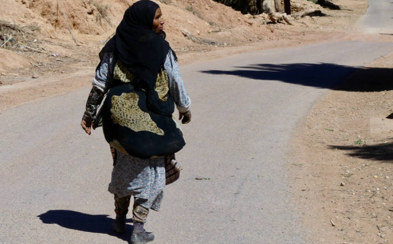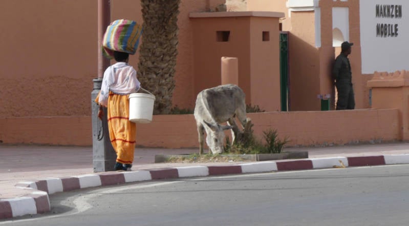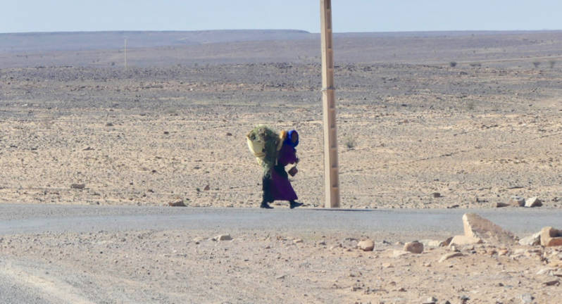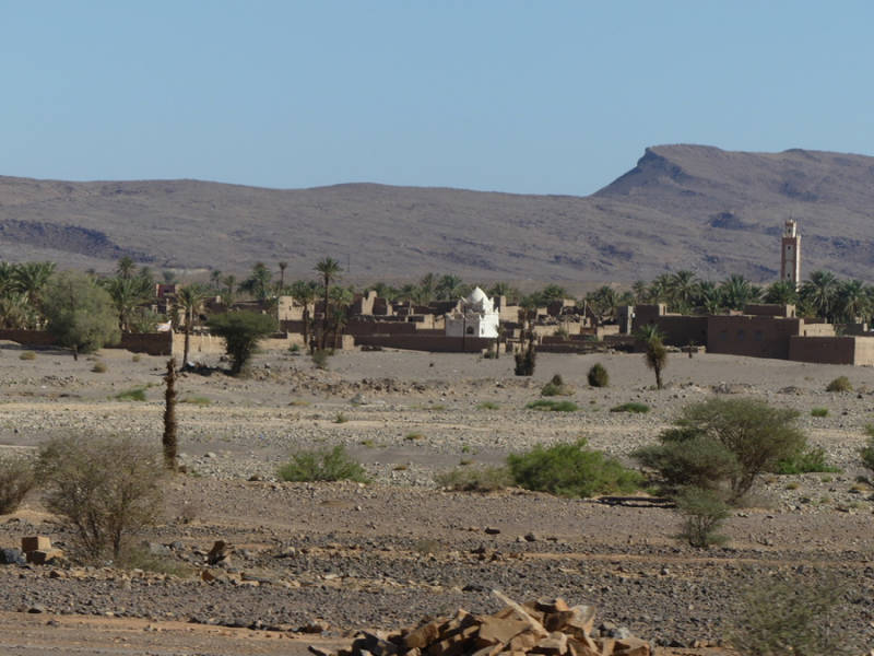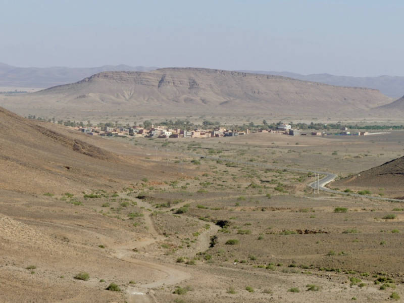 Je rijdt 70km door een steenwoestijn met slechts enkele gebouwtjes met zonnepanelen om pompen van energie te voorzien die het water oppompen om de spaarzame akkers te bevloeien. Na 70 km kom je in het dorp Taghbalte en dan heb je langs een nu droge rivierbedding oases en af en toe een dorpje, 35 km lang tot in Tazzarine. Vooral op het eerste deel van de N12 was er erg weinig verkeer , daar kun je beter geen pech krijgen.