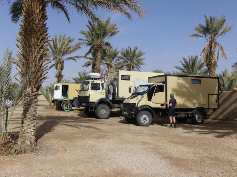 We hebben om de sfeer niet verder te bederven er maar niet bij gezegd dat we geen zin hadden om bij te dragen aan de vernietiging van het ecosysteem in de Sahara, we hebben in Merzouga maar al te vaak 4WD’s en quads door de zandduinen zien jakkeren. Dan bedoel ik niet de ‘Afrikawagens’, de 4WD trucks, die volgen bepaalde routes. Deze camping schijnt een soort ontmoetingsplaats te zijn voor Duitsers met die trucks, er staan er hier nu 3 nadat er vanmorgen 2 vertrokken toen wij kwamen. En gezien de manier van kennismaken hadden ze elkaar niet eerder gezien en bewonderden ze elkaars trucks en maken foto's van de voertuigen, the boys with the toys en er wordt ook meteen gesleuteld