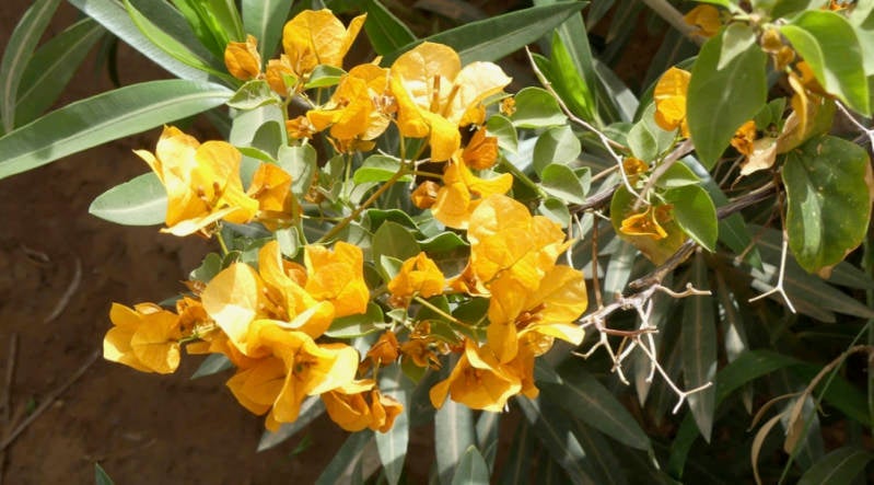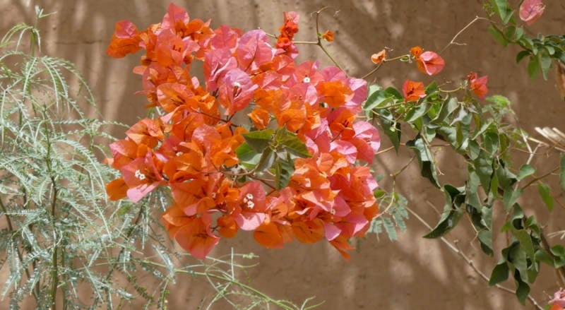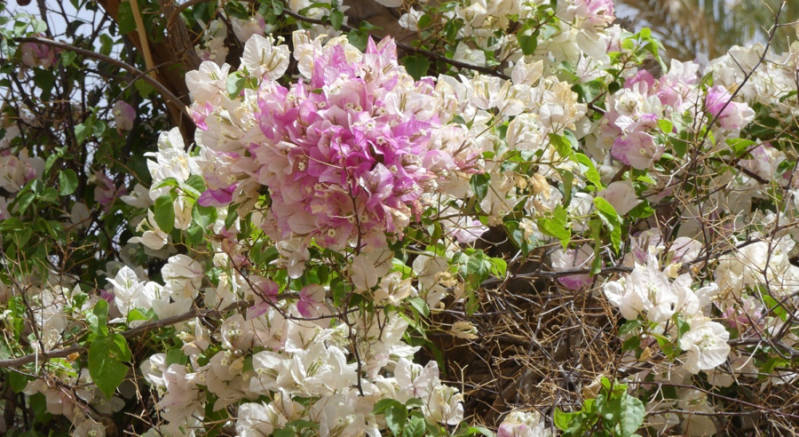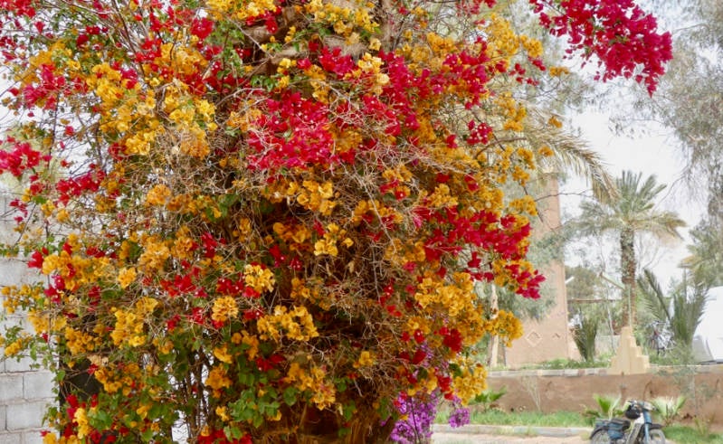Zoals gezegd staan we op dezelfde plaats als we eerder stonden. Nu staan er in het tuintje achter de camper naast tuinbonen en een soort tarwe ( voor de couscous), ook koriander en kleine uitjes. We hebben 14 dagen geleden koriander meegenomen uit de tuin en verpakt in een plastic zakje in de groentela gedaan . De koriander is nu nog vers terwijl hier in het tuintje de koriander staat te bloeien en ook de uitjes zijn doorgeschoten, die bloeien ook. Het heet hier niet voor niets Jardins de Zagora, er bloeien hier bougainvilles in verschillende kleuren, evenals oleander.