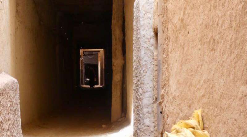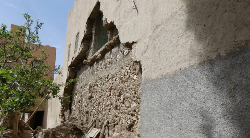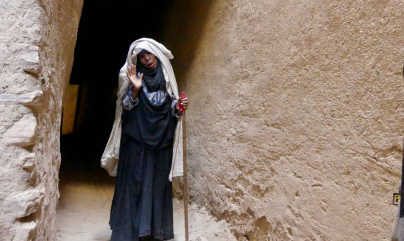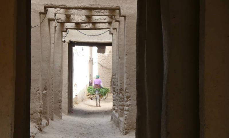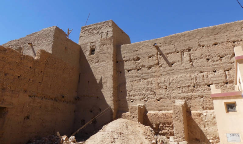 Voor de poort stond ook de Nederlandse groep van de NKC, dus nadat we bedankt hadden voor de diensten van een gids zijn we voor hun uit de ksar binnengelopen. Dan lijkt het of de tijd heeft stilgestaan, ezeltje vervoeren vracht door de smalle steegjes die deels ‘onderaards’ dwz onder de huizen door lopen. De tijd lijkt te hebben stilgestaan, je hoort links en rechts vrouwen telefoneren, of het smart phones zijn weten we niet ook dat zou zo maar kunnen. Maar je ziet ook armoede, zoals je overal in Marokko nog kunt zien. Door weersinvloeden zijn er af en toe huizen ingestort, bij een huis die deel uitmaakte van de ommuring was nog maar kortgeleden een gedeelte van de dikke lemen pleisterlaag naar beneden gestort. Nu doen de muren van de ksar geen dienst meer, vroeger waren ze een verdediging tegen aanvallen van vijandige Berberstammen, oorlog is van alle tijden.