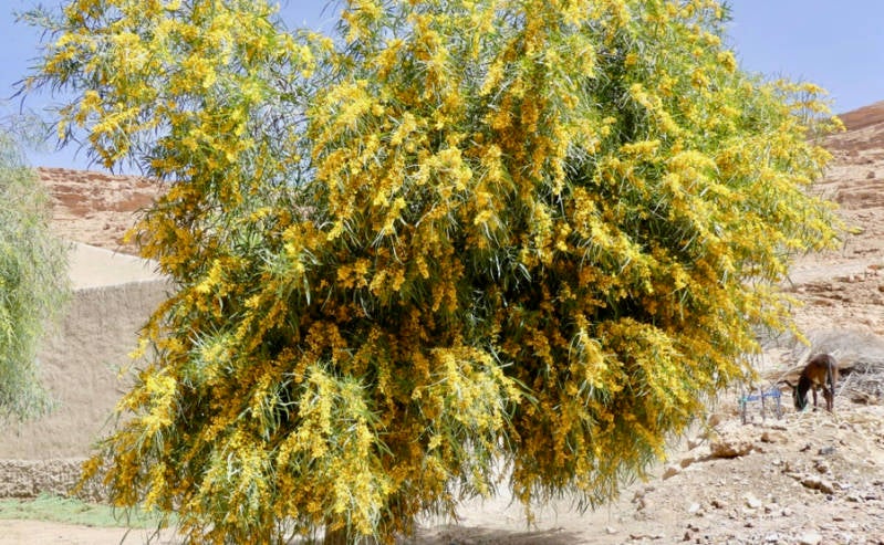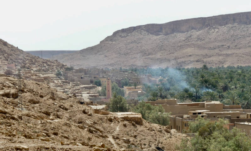 De Ziz vallei, rook kringelt omhoog(vuilnis wordt verbrand), beneden in de oase ligt een ksar, afgedaald naar beneden aan de rand v.d. oase, bloeiende mimosa
