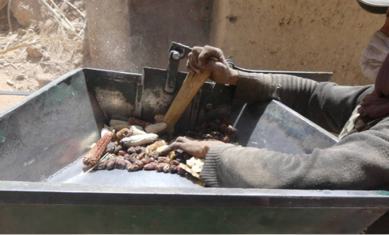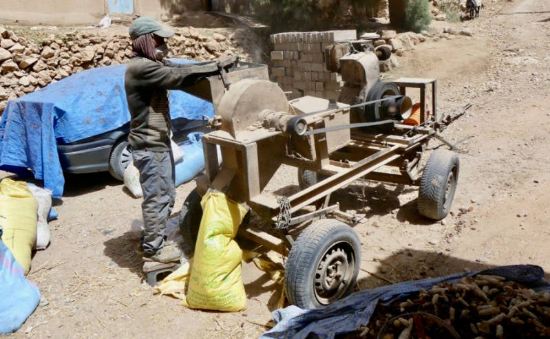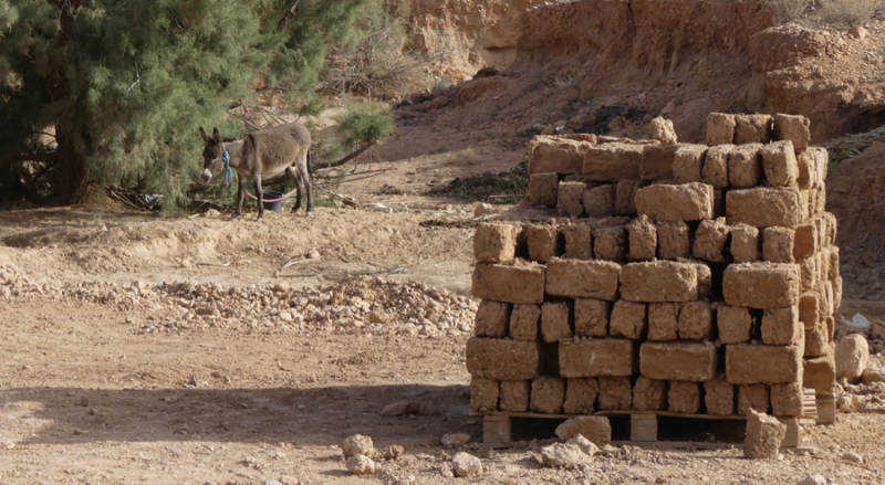 In de ksar was een man bezig om in een molen dadels, lege maiskolven en oud brood te vermalen. Hij vertelde ons dat het dadels waren die niet voor menselijke consumptie geschikt waren en nu als veevoer diende. Het eindproduct ging in zakken en kon verkocht worden.