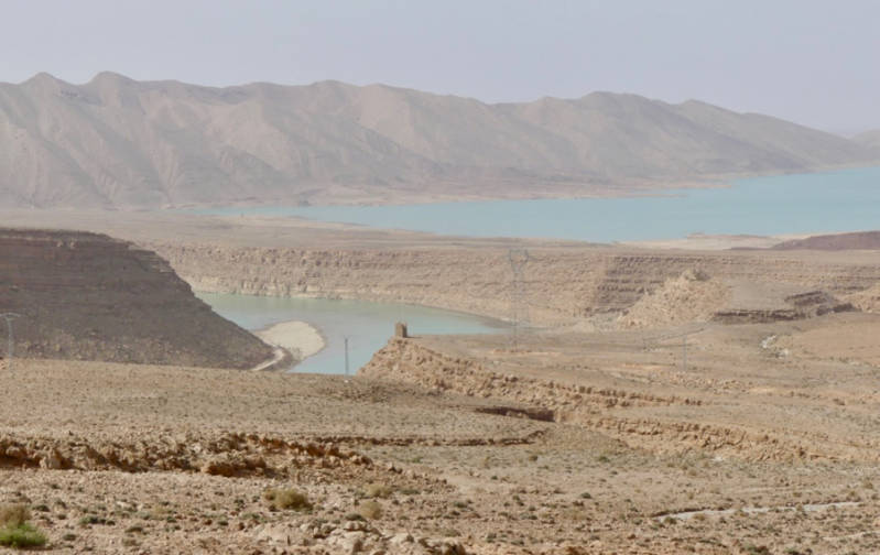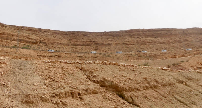 We kwamen uit bij het stuwmeer Hassan Addakhil en vervolgens kwamen we in het noordelijke deel van de Ziz vallei, de Gorges du Ziz. Heel anders dan het dal van de Ziz met de oases waar we vandaan kwamen maar wel erg mooi met prachtige kloven, helaas is het ook vandaag weer heiig, zodat de vergezichten wat wazig waren. Na de tunnel van de Légionaire, gebouwd door het vreemdelingenlegioen in 1927 zijn we even gestopt om van het uitzicht te genieten, een andere mogelijkheid is er niet om even halt te houden.