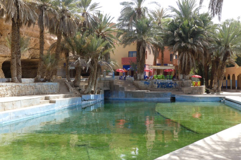 Er is hier een zwembad naast de camping, ’s zomers komt hier de jeugd uit Errechidia zwemmen. Het zwembad wordt gevoed door water die uit de zgn blauwe bron komt, die in een grot ontspringt. Overigens is het geen echte bron, het is een aftakking van de rivier de Ziz die onder langs de camping loopt en die hier meer een sloot is. De aftakking gaat ondergronds om in de grond weer boven te komen. Het heet de blauwe bron niet omdat het water hier blauw zou zijn zoals wel eens wordt beweerd, maar omdat vroeger hier de handelskaravanen met de ‘blauwe mannen’ kwamen om hun dromedarissen te laten drinken, het was ook een pleisterplaats.