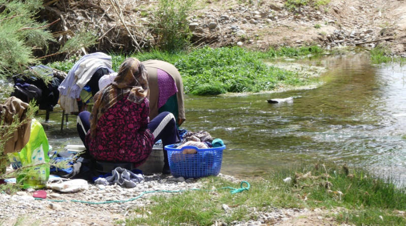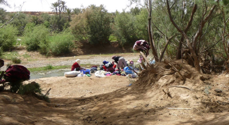 In de oase wordt groenvoer geoogst vrouwen doen de was in de Ziz