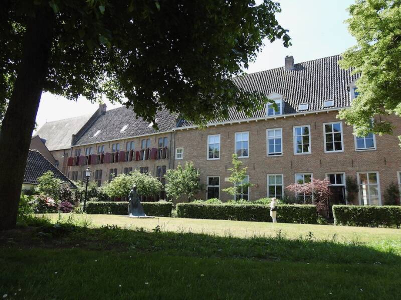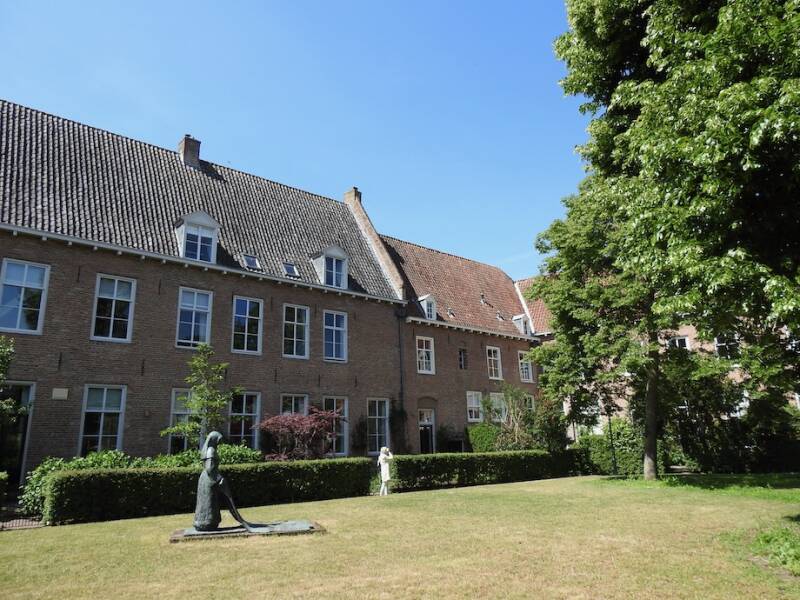 We zijn naar het Oude Bornhof gewandeld, het grootste bewoonde hofje van Zutphen. De geschiednis van dit hofje gaat terug tot ongeveer 1320 toen de rijke kanunnik Borro hier een huis bewoonde. Hij stelde zijn huis ter beschikking aan arme ouderen, in de middeleeuwen waren de zieken en de ouderen die niet meer voor zichzelf konden zorgen, overgeleverd aan willekeur. Voor hen die een godvruchtig leven hadden geleid was vaak wel een plekje in een beschermde woonvorm. Ook hier dus dus was er voor vrome mensen, net zo als in andere hofjes, plaats in Zutphen.