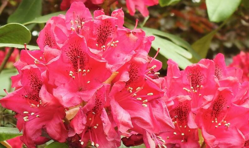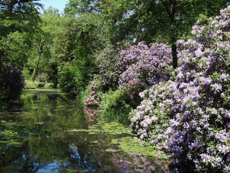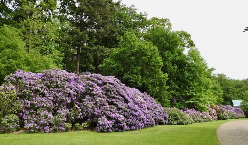 Je kunt door het park rondom het kasteel wandelen waar momenteel de rododendron struiken prachtig volop bloeien.