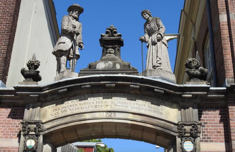 Boven de poort ingang van het Bornhof staan deze 2 oude figuren ( een replica) met daaronder een spreuk.