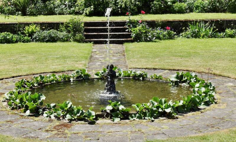 De lage tuin met rondom borders met planten die wisselend bloeien zodat je een 'aanhoudende bloei' ziet.