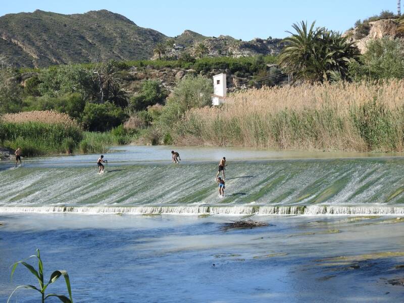 Het was maar 7km rijden naar Archena waar we nu staan op een grote parking bij sportvelden. Een gedeelte is voor campers, dat is het mooist gelegen deel, waarvan wij dan , vinden we , het mooiste plekje hebben. Er loopt hier nl de rivier de Segura en beneden ons is een weliswaar niet hoge, maar wel heel brede waterval die we kunnen zien vanuit de camper. En we kijken op de sportvelden waar aan het eind van de middag kleintjes voetballes kregen en in het begin van de avond wat grotere jongetjes op het veld verschenen.