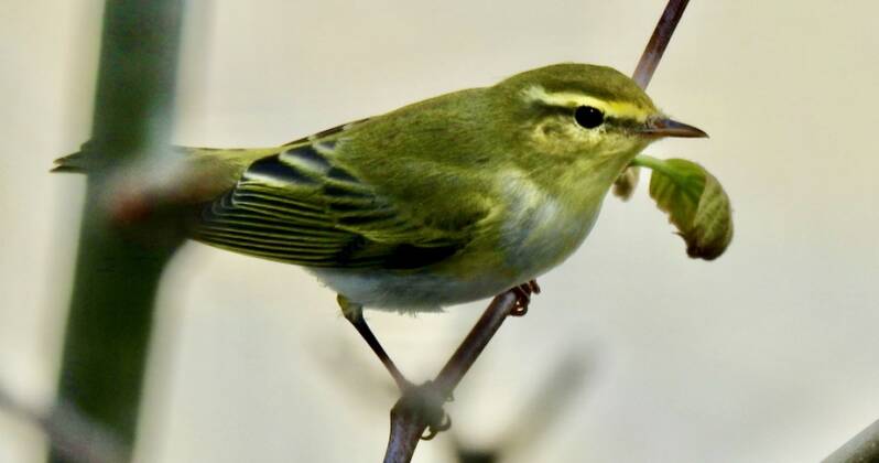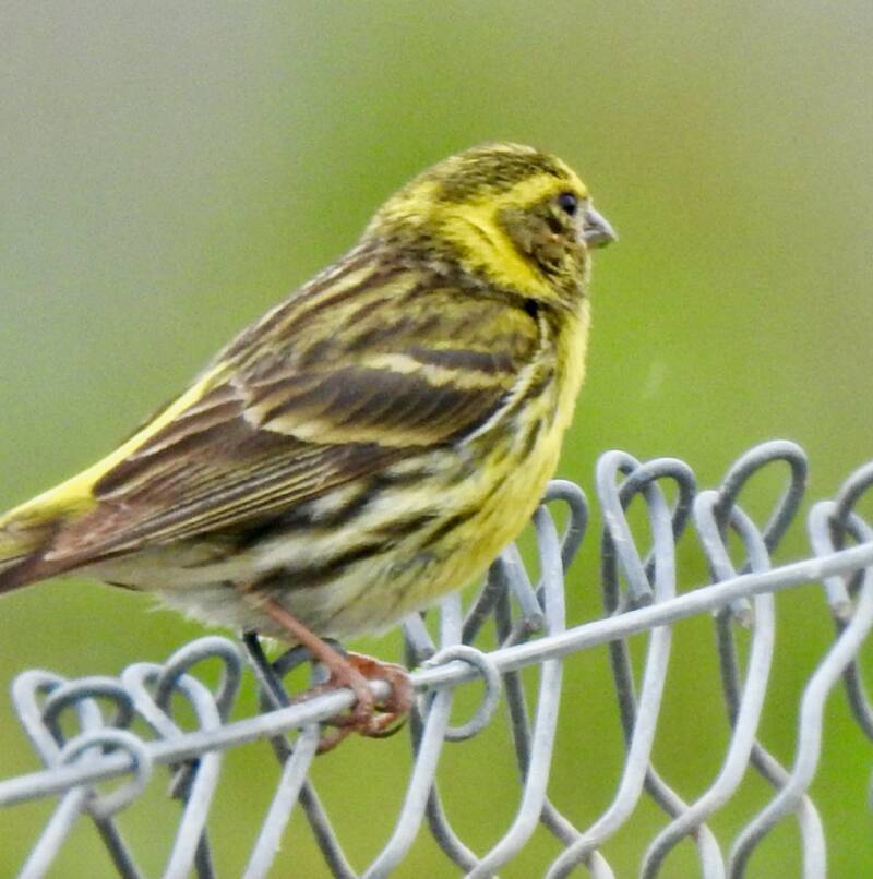 Bij de camper op een hek een Europese kanarie, de staart achter een hekpaal.