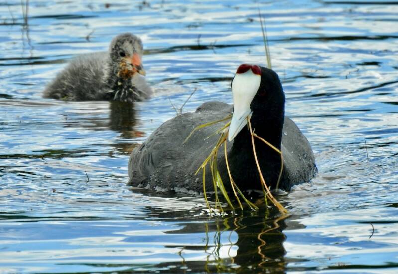 Lente, meerkoet met kuiken. En niet zo meer een meerkoet, het is de zeldzame knobbelmeerkoet. ( zie boven op kop)