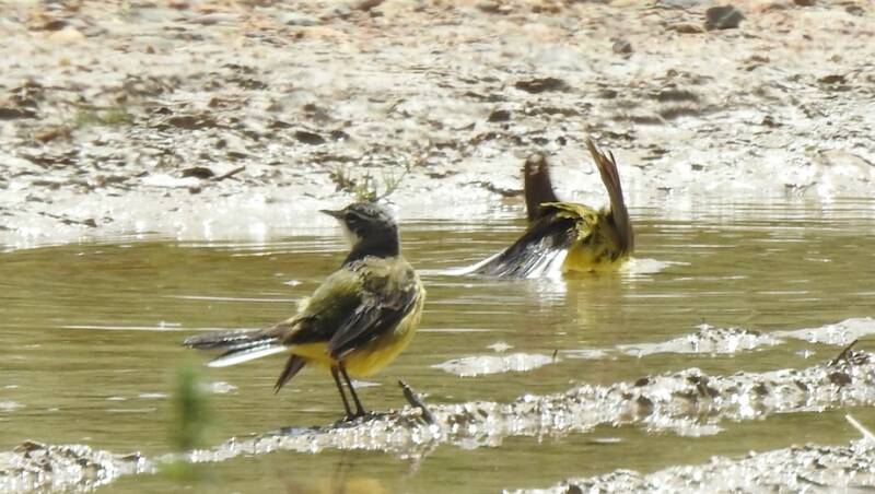 Een paartje gele kwikstaarten baddert in een plas, eentje gaat kopje onder met de vleugels in de 'duikstand'.