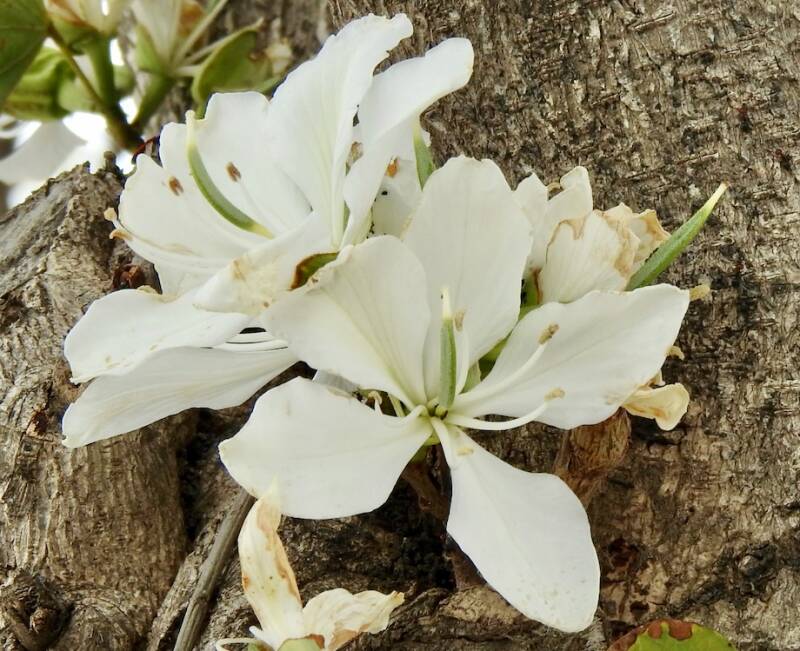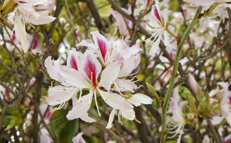 Bauhinia variegata, de Bloeiende Orchidee boom wordt die ook wel genoemd, bloeit hier in 3 verschillende kleurvarianten.
